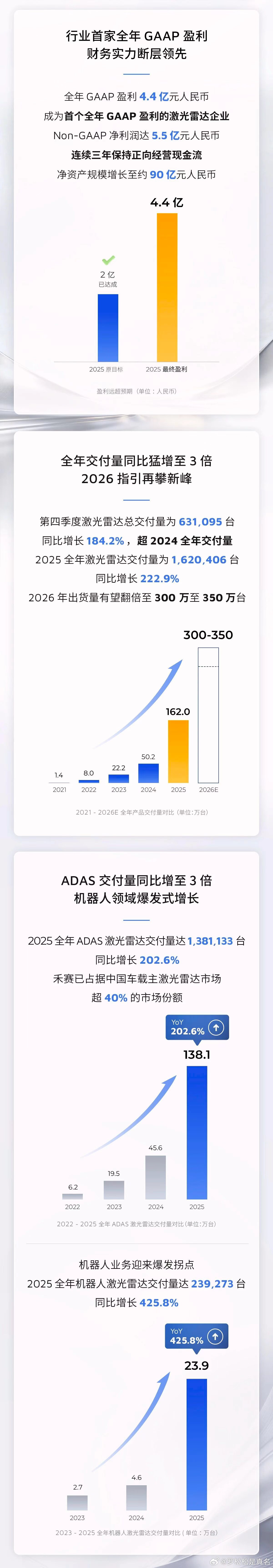 这两家激光雷达企业的缠斗已经快十年,而且还会继续下去。但两家对2026年都给出了至少翻倍、300万台以上的出货预期,也算是相爱相杀携手做强的典范了。