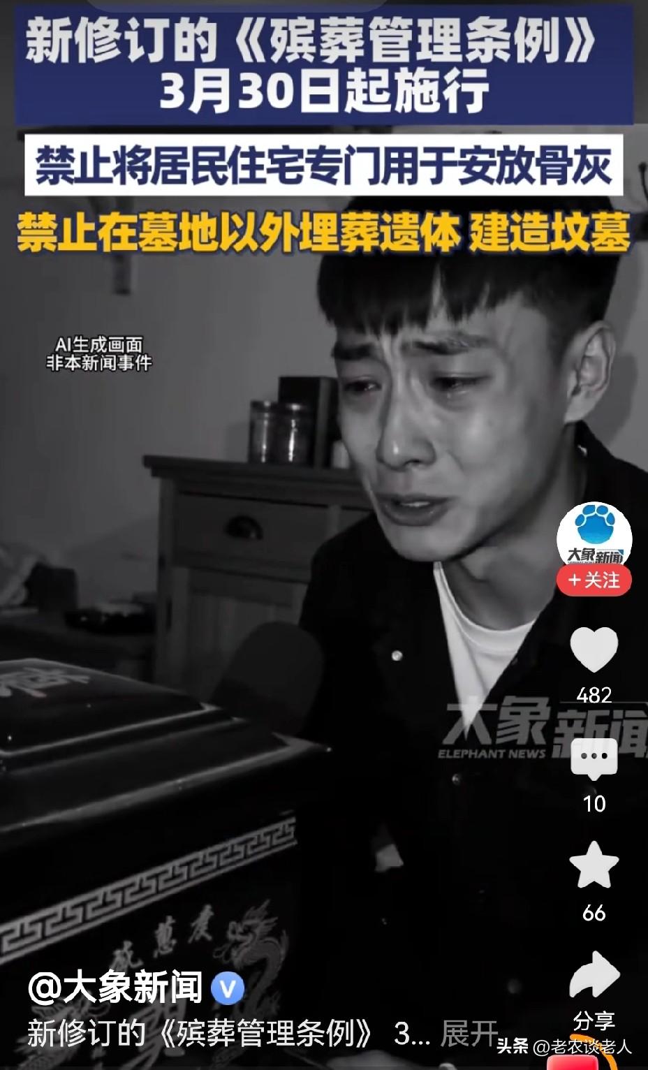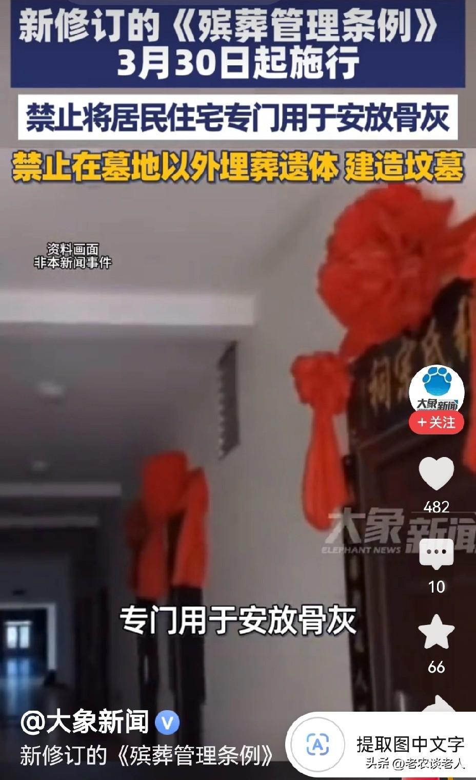 3月30日起禁止居民住宅专门用于安放骨灰! 清明节快到了,有很多人,很多家庭,因为买不起墓地,便和亲朋好友几家庭,甚至十几个家庭,合伙购买一套商品房,用来存放家里离世的人的骨灰盒。 这种怪异的社会现象,在当今的社会上非常流行,叫做私人骨灰房。这样把一栋好好的住宅楼,只因有一家或几家购买的房子,用作存放离世人的骨灰盒,让整栋住宅楼的居民,提心吊胆,魂不守舍,从而不能好好的生活和工作,导致不得不想尽千方百计搬离这栋住宅楼,给非常多的居民带来经济和心理的压力,给社会造成了非常难以解决的诸多问题。 据媒体3月26日报道,新修订的《殡葬管理条例》从3月30日正式实施,禁止在居民住宅专门安放骨灰,禁止在墓地以外安葬遗体和建造坟墓。 这样一来,在城市和乡镇的居民住宅楼上,再也不会出现有安葬骨灰的房间,已经安葬有骨灰的房间,将会依据新修订的殡葬管理条例,将一一给予清除掉,还居民一个安静祥和的居住环境。 以上是本人观点,如有不妥,请大家在留言出处,留下你宝贵的意见,并积极参与评论,特邀请大家关注社会热点问题。放骨灰盒 殡葬设施规划 3月30日起禁止住宅专门用于安放骨灰