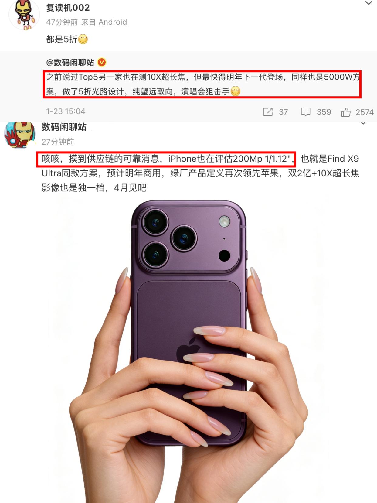 太炸裂了,iPhone 19 Pro爆料2亿像素镜头! 苹果的爆料来的一如既往的早,iPhone 18系列还没发布呢,iPhone 19系列爆料就来了,离大谱! 数码闲聊站刚透露,iPhone 19 Pro会考虑用2亿像素大底镜头,终于是舍得用高像素镜头了,难道2027年的iPhone拍照体验要大升级了?据说这个还是OPPO Find X9 Ultra的同款方案,那感觉挺对味的啊! 只不过Find X9U这下个月就来了,OPPO这是直接领先苹果一年半啊?之前看爆料还说,OPPO的10X光变长焦镜头,后面也还有另一家top5的厂商要用,也是领先一年 只能说OPPO在镜头堆料这块还是很权威啊,这次Find X9U的双2亿双潜望+哈苏色彩镜头的配置,每个镜头都挺狠的,高管分享的样张优势明显,真实还原拍出压缩感人像,看后面还有没有其它友商学?