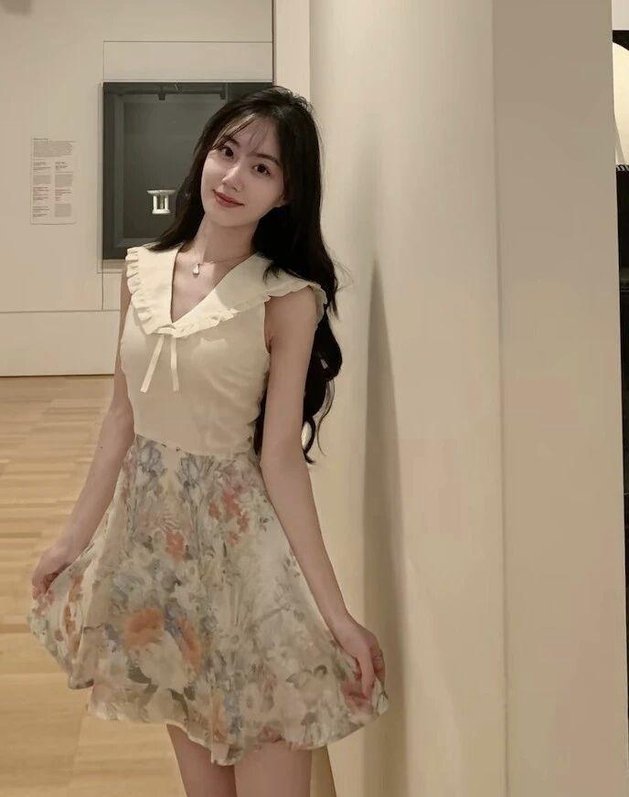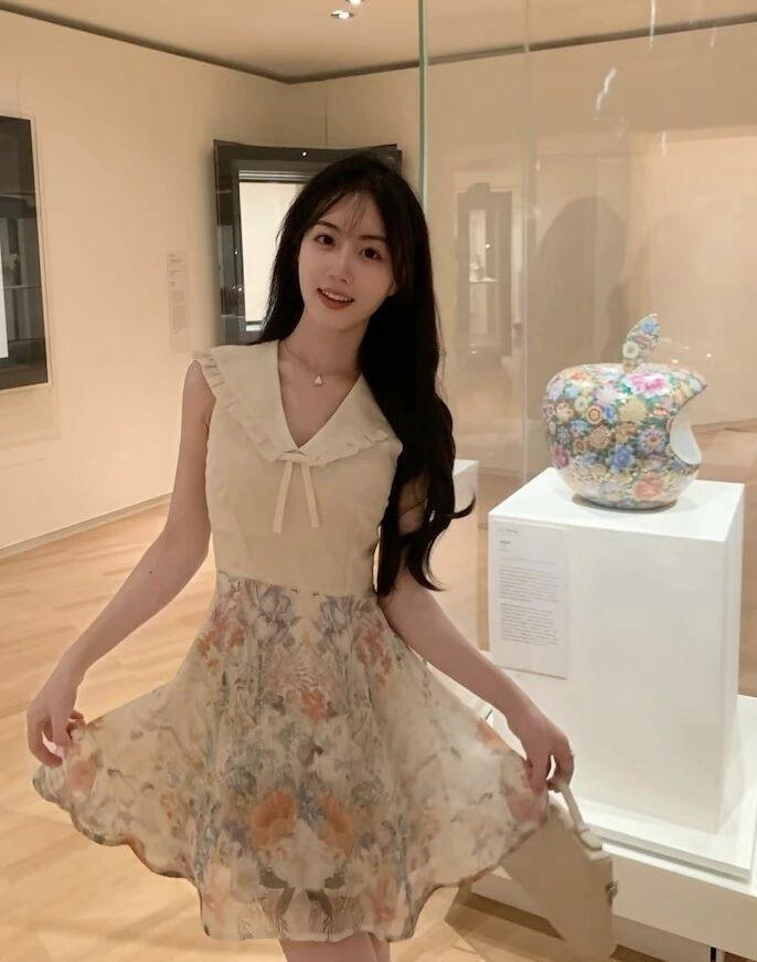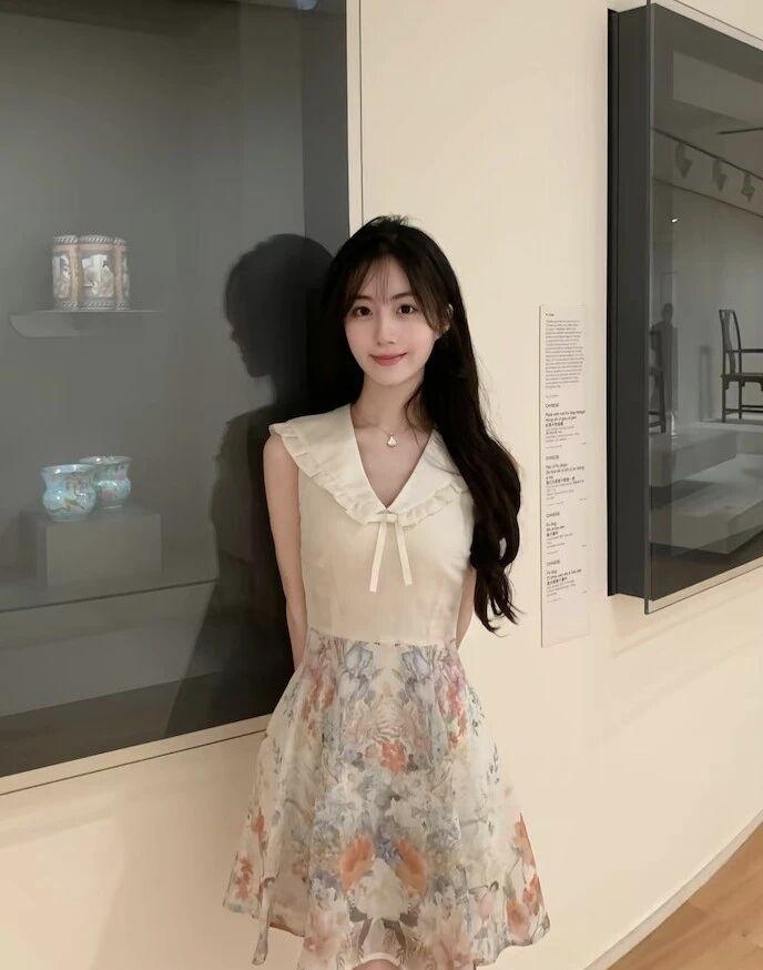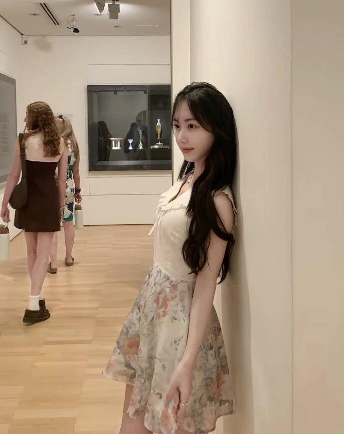 在艺术馆里,穿着花裙子的女孩,微笑面对镜头。