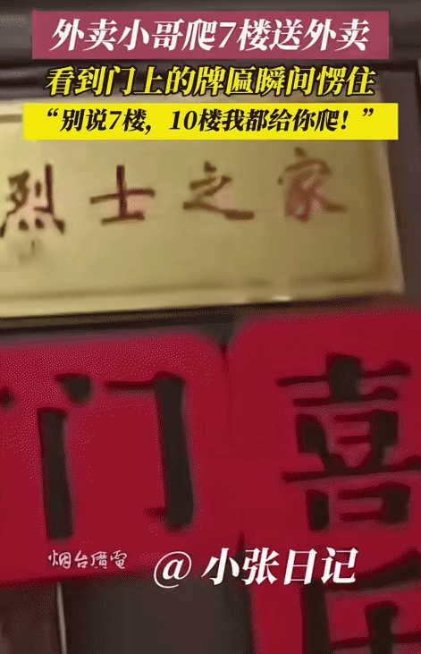 泪目了!江苏,一位外卖小哥爬7楼送外卖,心里正不爽时。突然,他抬头一看,门上两块牌匾让他瞬间愣住,他红着眼眶说: “别说是7楼,10楼,我都给你爬。” 原来,这天小张接了一单,他去店里取到餐的时候,看到客户备注: 骑手辛苦了,请送上楼,家里父母老人在家。当他来送餐目的地,却发现没电梯,他只好爬楼梯。 而且客户家是住在7楼,当他爬到7楼时,已经累得气喘吁吁,心里还有点不爽。可他抬头看到客户门上的两块牌匾时,他先是瞬间愣住。随后他说: “这个必须得送。”他说着,还对着门口敬了一个礼。 因为门上的这两块牌子,有一块是“光荣之家”,另一块是“烈士之家”。 他整理了下情绪,按了门铃后,是一位老人给开门,对方从门缝接过他递过去的外卖。 随后老人跟他说: “谢谢啊!”他说: “没事,没事。” 他下楼时,他说: “刚才一抬头,看到烈士之家的时候,心里咯噔一下子,那一瞬间大脑一片空白。经常在外面跑,光荣之家经常见,烈士之家,还是第一次见。这是英雄之家,别说7楼了,10楼我都给你爬。” 他后面因心情久久没能平复下来,犹豫许久,给这位客户发了个信息,意思是下次如果老人不方便,有需要爬楼送东西,随时找他。他还留了电话,对方回复了“谢谢”。 这一幕也是让网友们泪目了。 有网友说: 开头没注意看,后来看到烈士之家的那一刻,眼泪不由自主的流了下来,我也是一名退役军人,知道那块牌子的沉重。 也有网友说: 善举善行善言,总能在外卖小哥们的身上看到,他们善良淳朴,值得尊敬!他的一番话,让我们知道了烈士之家,想到了为国捐躯的烈士们,清明节即将到来,让我们致敬英雄! 还有网友说: 很多人都理解错了,不是一门两烈士,光荣之家是入伍当兵的牌匾,而烈士之家是当兵之后牺牲了的牌匾! 看到这个“烈士之家”这个牌子,心情一下子沉了下来。像是这位外卖小哥,这哪是送外卖,他明明是给英雄递一份敬意! 是的,别说7楼,就是10楼、20楼,每一步都是对烈士的致敬,也是对荣光的守护。 而外卖小哥下楼后,他的心情久久不能平复,主动给客户发信息留下电话,说以后老人不方便随时找他,这是一种朴素却滚烫的善良。 这件事里,没有惊天动地的大事,但却让我们看到了普通人对英雄最本能的尊崇。 要知道我们今天的安稳日子,就是无数这样的家庭用牺牲换来的。而外卖小哥的说的一句“别说7楼了,10楼我都给你爬”,这是刻在骨子里的敬畏,是我们中国人最朴素的家国情怀,为这位外卖小哥点赞,更向烈士家属致敬,英雄永垂不朽! (来源: 烟台广播电视台)