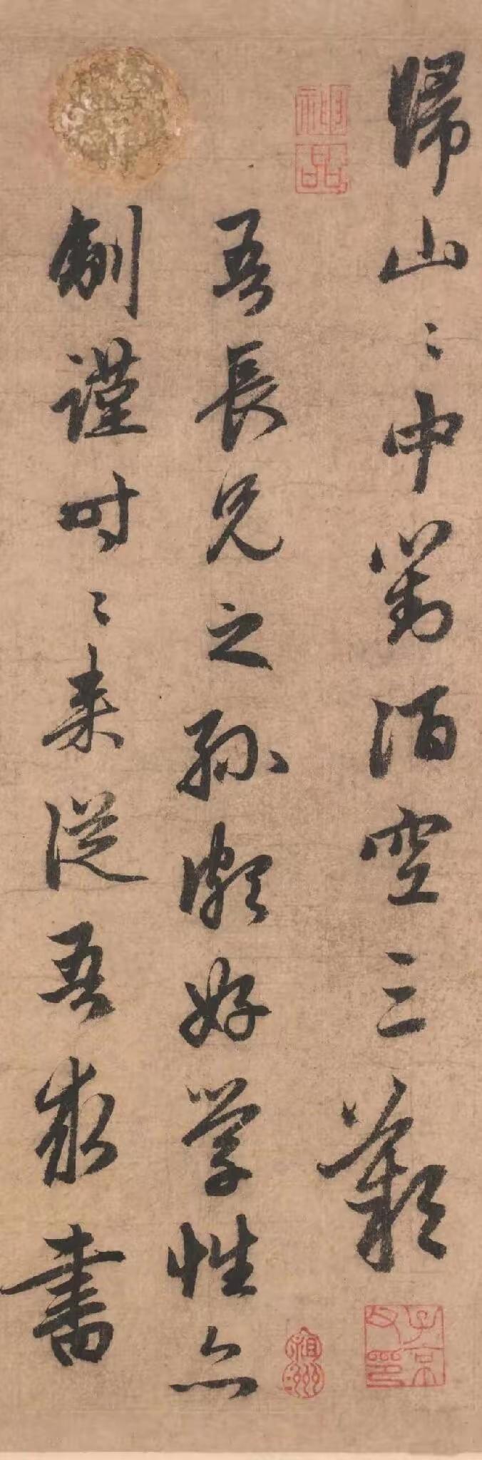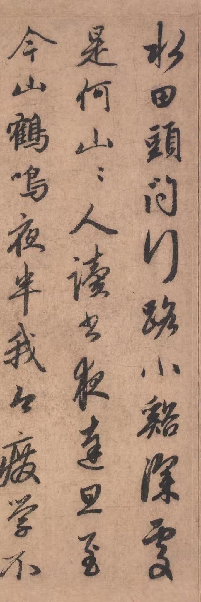 《道场何山诗帖》是赵孟頫晚年行书的精醇之作。此卷笔法圆熟而内蕴骨力,中锋行笔为主,线条圆润饱满、立体感强,提按转折间节奏自然;偶用侧锋增添妍丽之姿,于端庄中透出灵动。结体巧妙融合楷书的宽博与行书的欹侧,字形大小参差、姿态生动,在严谨的法度中寻求险正之趣。全篇章法疏密得当,行气连贯而富有韵律,流露出清逸温润、典雅洒脱的意蕴。作为其“复古出新”理念的典范,此作既深得晋唐风骨,又注入个人情致,笔力苍劲练达,毫无晚年衰颓之气,反而愈见炉火纯青的艺术境界。作品因刻入《三希堂法帖》流传益广,足证其在书法史上的典范地位。