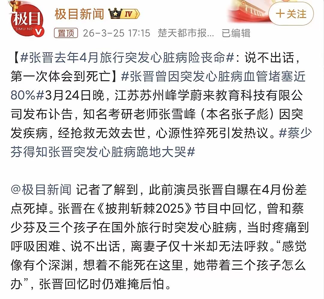 张雪峰去世以后,张晋登上热搜! 3月25日,演员张晋上了热搜,万万没想到,原因竟然与张雪峰有关。 按理说,一个是演艺圈的明星,另一个呢又是教育界的精英,这两人可以说真的是八竿子都打不着的关系,真的很难想象他们会被联系到一块儿去,那么这到底是个什么样的情况呢? 根据一些媒体方面的报道,张晋在去年4月份出去旅游的时候,突然就发作了心脏病,差一点儿就没命了。 正是因为都碰上了这个心脏方面的问题,才把这两个本来是毫不相干的人给绑在了同一个热搜上。 张雪峰老师因为心源性的问题猝死,年仅41岁,真的是太可惜了。 而张晋呢,他今年51岁了,一直以来都是个武打硬汉的形象,他是在去年去新加坡旅游的那个时候,血管一下子就堵了差不多有80%。 那个时候,他离他老婆蔡少芬才十来米远,但是却疼得连话都说不出来了,完全就是靠着自己的意志力在硬撑着。 他的心里当时就只有一个念头:自己可绝对不能死在国外,不然的话,老婆和孩子们可怎么办啊 所以他回去之后,马上就去做了心脏支架手术,医生后来还说,要是再晚来个半小时的话,人可能就没了。 所以说,大家千万别觉得仗着自己年轻、身体底子好就万事大吉了,身体给出的那些预警信号,可千万不要忽视掉啊。 你看,就连硬汉也顶不住心脏的这种突然袭击,所以说,健康这个东西,真的比什么都要来得重要。