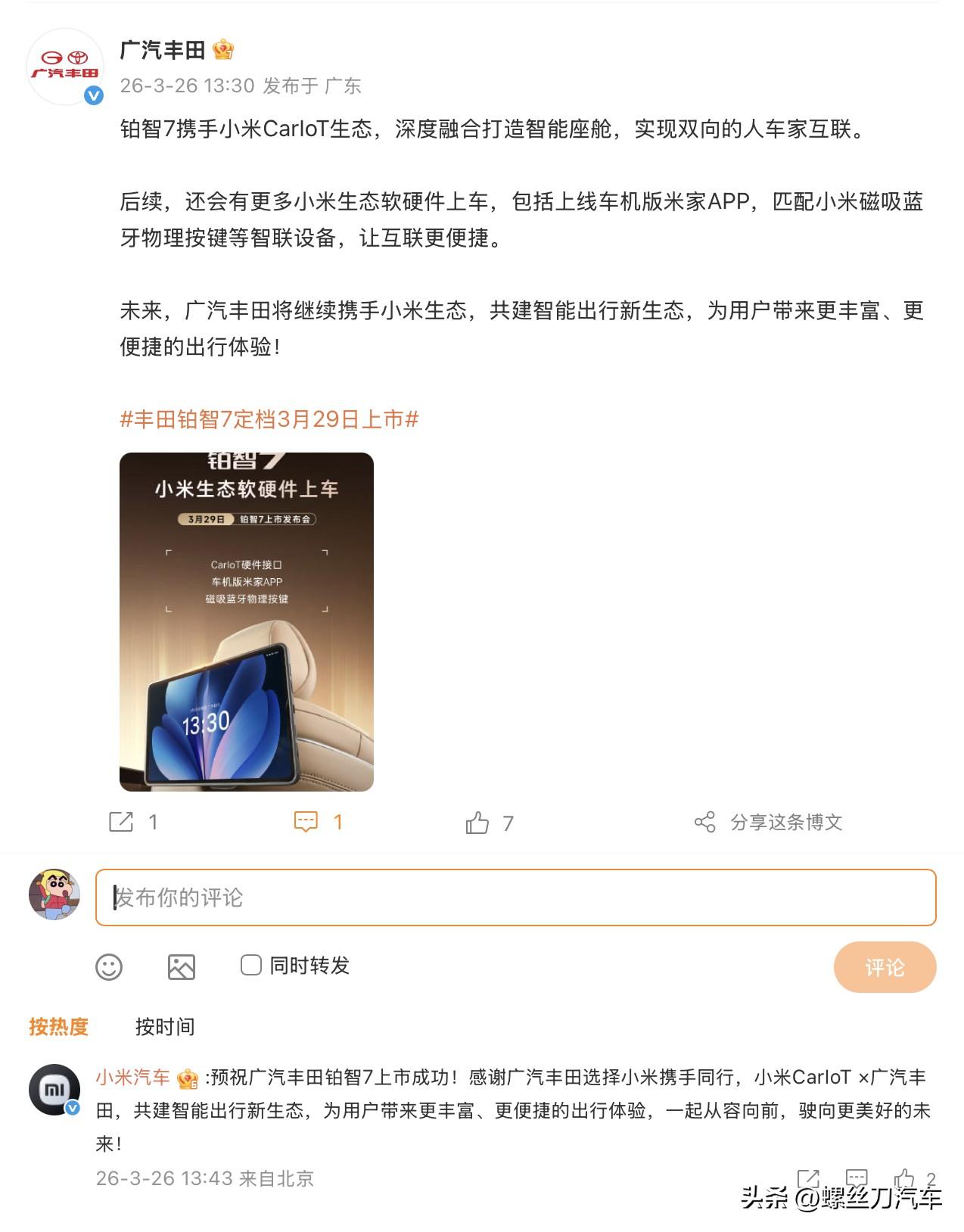 小米负责人体验铂智7小爱同学!小米生态已在铂智7上真实落地,不是停留在合作层面,米家APP可实现车控家、家控车,减少多APP切换;后排Pad可无缝上车;后续还将上架车机版米家APP。 小米负责人给出直接体验结论,铂智7不只是“能连”,而且“好用、好开”,铂智7在动态体验上“开起来挺舒服、底盘很扎实、豪华质感不错、很沉稳”。 可以说,铂智7的价值不只是单一生态,而是把鸿蒙、华为电驱、小米生态都真正揉进整车体验了,新车即将在3月29日上市交付在即,这次小米负责人试驾丰田铂智7等于是上市前的一次科技圈提前验证,铂智7很值得期待!