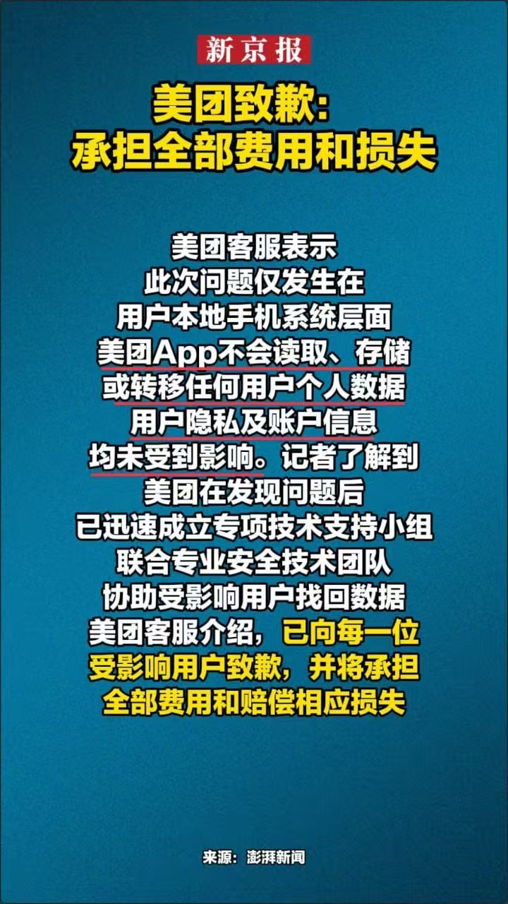 秦岭笑谈 美团删相册事件:道歉不够,必须彻查!美团删除用户照片美团致歉美团最新回应:承担全部费用和损失!2026年3月17-20日,一场骇人听闻的“删相册”事件席卷全网。华为、小米、荣耀、iQOO等主流安卓用户,在未主动操作美团的情况下,手机相册内大量照片、视频被批量清空。事件三大诡异点,细思极恐:1. 后台静默删除:用户毫不知情,APP在后台自动执行删除指令。2. 系统拦不住:即便华为/荣耀弹出“美团删除多媒体文件”的高危提示,依然无法阻止。3. 范围极广:几乎覆盖所有主流安卓机型,绝非个例,而是系统性bug或权限滥用。美团的回应轻飘飘:一句“承担费用”,就能抹去无数家庭的珍贵回忆吗?照片是不可再生的情感资产,不是用钱就能衡量的。这已经不是简单的技术事故,而是对用户隐私底线的严重践踏!一个餐饮外卖软件,为何能拥有如此高权限,随意操控用户本地文件?背后是否存在数据收集的过度越界?必须严查! 给所有用户一个交代,还手机一个安全的环境!