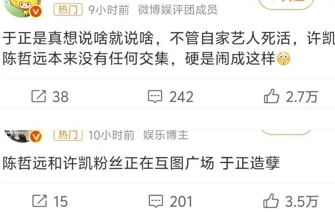 有点看不懂陈哲远的操作了。 拍《江山为聘》时,内涵陈哲远最多的人是于正, 说他摆不正自己的位置,说他被全行业看笑话。还说他的粉丝是脏东西…… 好几次都闹上了热搜[笑哭] 就在路人以为这俩人会结下梁子时,陈哲远和于正互关了? 他还关注了江山为聘的配角梁咏琪,还关注了于正旗下的一哥许凯,二哥王星越, 唯独没关注剧中和他合作最多的吴谨言?[捂脸] 这波奇怪的操作也是让人有点猜不透了! 今天,陈哲远又关注了于正公司的流量一姐白鹿,估计下一步俩人会有合作吧。 不知道这一次,于正还会继续挤兑陈哲远吗?