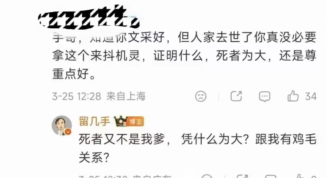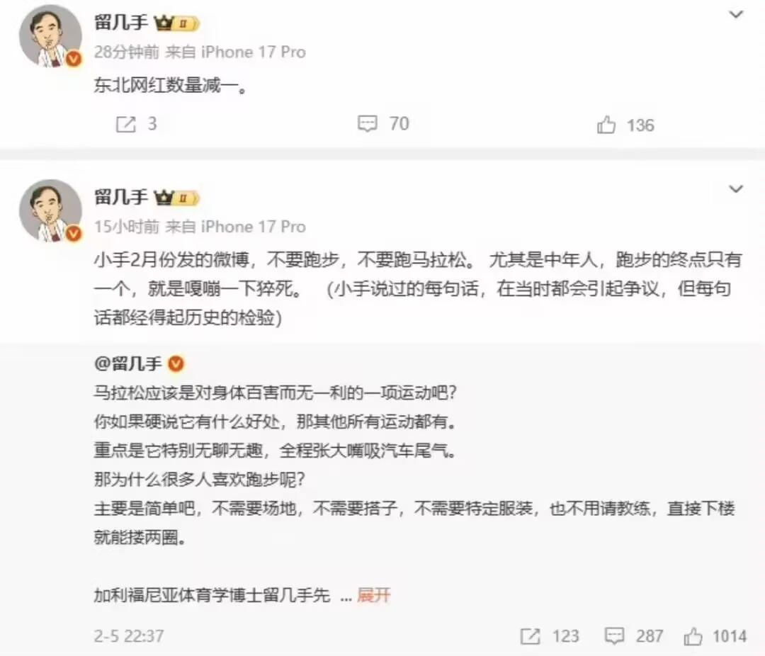 不到两天 恶心一幕出现了 张雪峰走后第二天,大网红留几手发布了一些令人生气的动态,语气了充满了调侃。 3月25日,留几手就发了“东北网红减一”的动态,意思很明显,认为张雪峰只是个网红,他的所作所为只是为了红。 紧接着,他又连发两条关于马拉松的动态,而似乎想要通过张雪峰,证明自己的观点对么多,然而这就像网友说的,很抖机灵,别人刚刚离开,就拿人家来调侃,这严重不尊重,而粉丝提醒他,他还一脸不情愿,觉得和自己没关系。 最终,因为这事被禁止关注。 在简介中写着留学博士,更应该懂得尊重,没有教养的文凭,不过是空洞的白纸罢了。 对此,你怎么看?