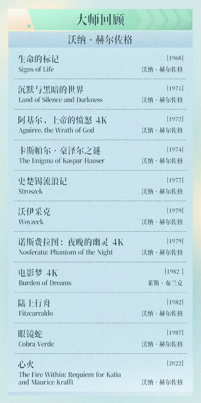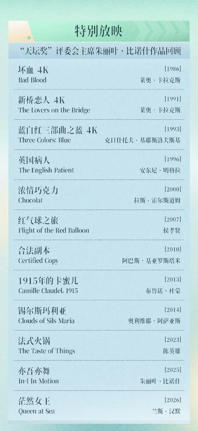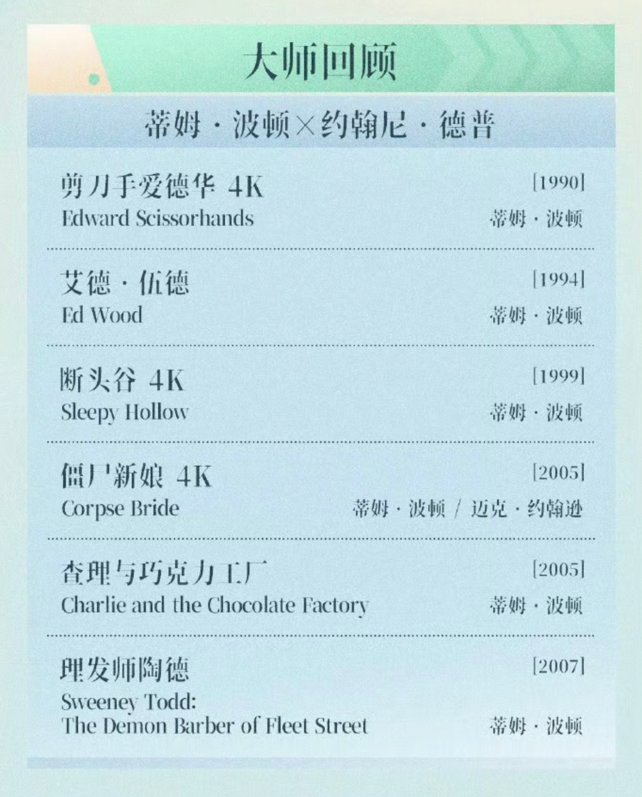 其他重要影人单元包括“天坛奖”评委会主席朱丽叶·比诺什主演的12部,德国导演沃纳 • 赫尔佐的11部,蒂姆·波顿与约翰尼·德普合作的6部,贝拉·塔尔改编克拉斯诺霍尔卡伊·拉斯洛的5部。