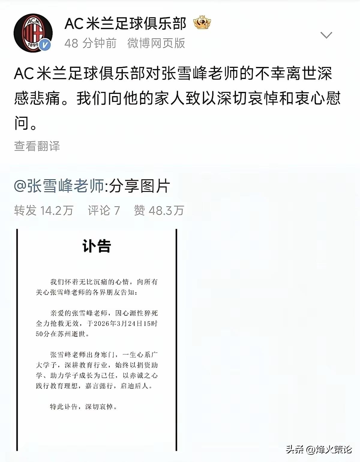 官媒对一个普通人离世的报道, 体现了国家层面对张雪峰老师的认可。 新华社、人民日报、央视新闻…… 这些平日里高高在上的“国社”、“央妈”, 竟然齐刷刷地转发了一则关于他的讣告。 张雪峰老师用专业与热爱, 点亮了万千学子的升学路, 以一介平民之身获官媒定格, 既是他的荣幸,更是时代的温暖。 这世间最动人的荣光, 从来都属于那些平凡 却不甘平庸、普通却心怀他人的人。