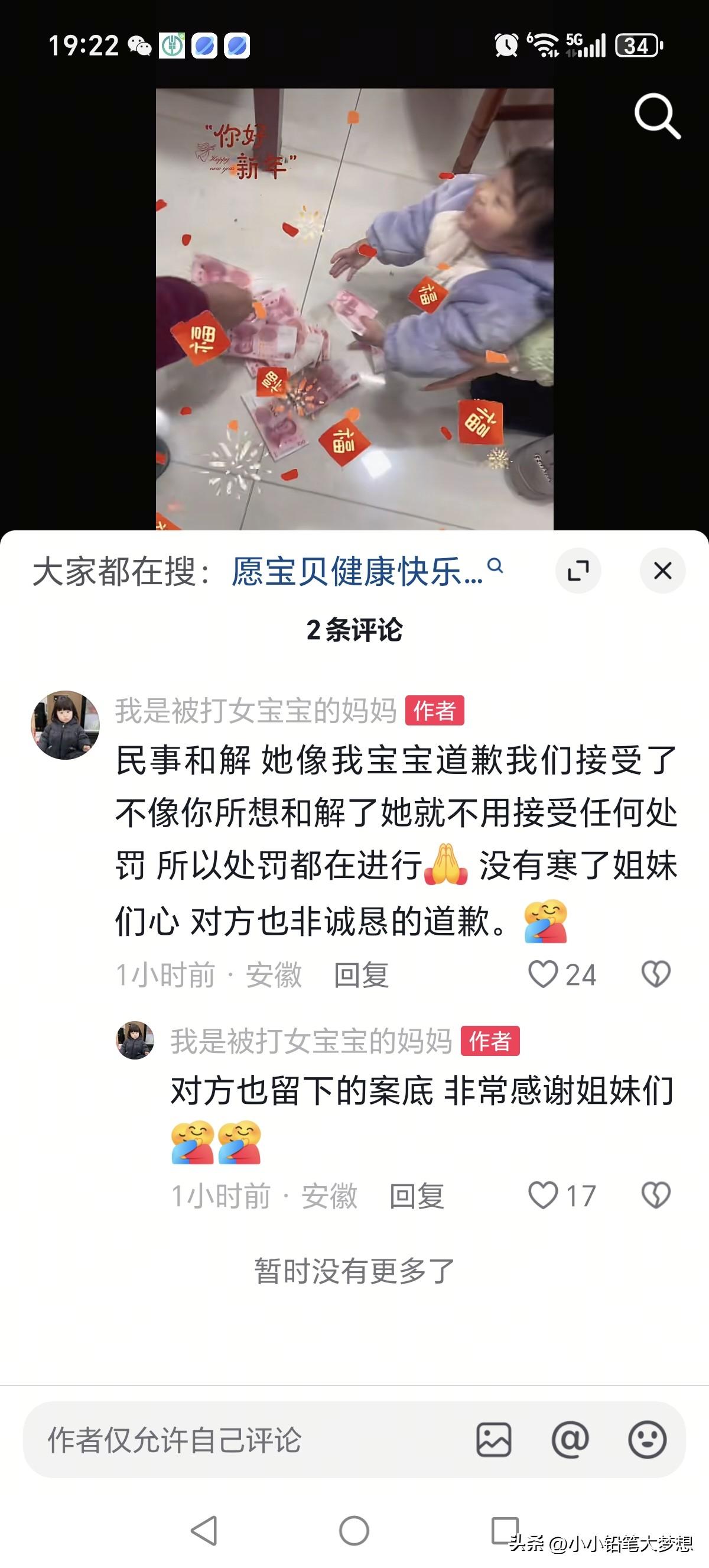 安徽六安2岁女童被打骨折,最新的消息来了,双方已经达成和解!不是说“绝不和解”吗?受害者妈妈最新的回应解释说:“民事和解,她向我宝宝道歉,我们接受了,不像你所想和解了,她就不用接受任何处罚 所以处罚都在进行, 没有寒了姐妹们心,对方也非诚恳的道歉。”后面还补充了一句:“对方也留下的案底 非常感谢姐妹们!” 所以说啊,这份通报写的很隐晦,这位宝妈虽然把视频下架了,但是她还是第一时间出来交代,其实所谓的和解没有真正的和解,因为对方已经留下了案底了。 我没想到这个女人已经34岁,34岁,这是第一个孩子,还是第二个孩子? 34岁应该也不是冲动的年纪了,竟然殴打才两岁的幼童,且明明是自家的孩子,抢了人家的玩具,还追着人家的孩子殴打,这种行为真的挺恶劣的。 你家孩子是宝贝,人家的孩子就不是宝贝嘛?被打女孩的妈妈也说了,这个孩子是自己10月保胎生下来的,自己都没对她动过手,她一个大人居然能如此狠毒,把两岁的幼童打骨折了,她把人性的恶体现的淋漓尽致,都是身为女人,弱势群体如此以大欺小,持强凌弱,之后还一堆人围在人家的服务台前面闹事,还想用1000块钱打发人家,人家不同意坚决要报警,她还拍桌子瞪眼睛! 其实就是正常孩子之间很小的一个摩擦,因为抢玩具玩的一件小事情,人家不小心推了你家孩子,你心疼,其实可以理解,但是你应该是正面的引导孩子,让他们之间去解决问题,而不是采取这么暴力的行为,而现在,终于有了最新的结果,其实也大快人心了,因为女的为自己冲动的行为付出了代价,留下了案底,将来也会影响自己的孩子的,可没想到她还是那么倔,听受害者的妈妈说,她的道歉自始至终都没有诚意!