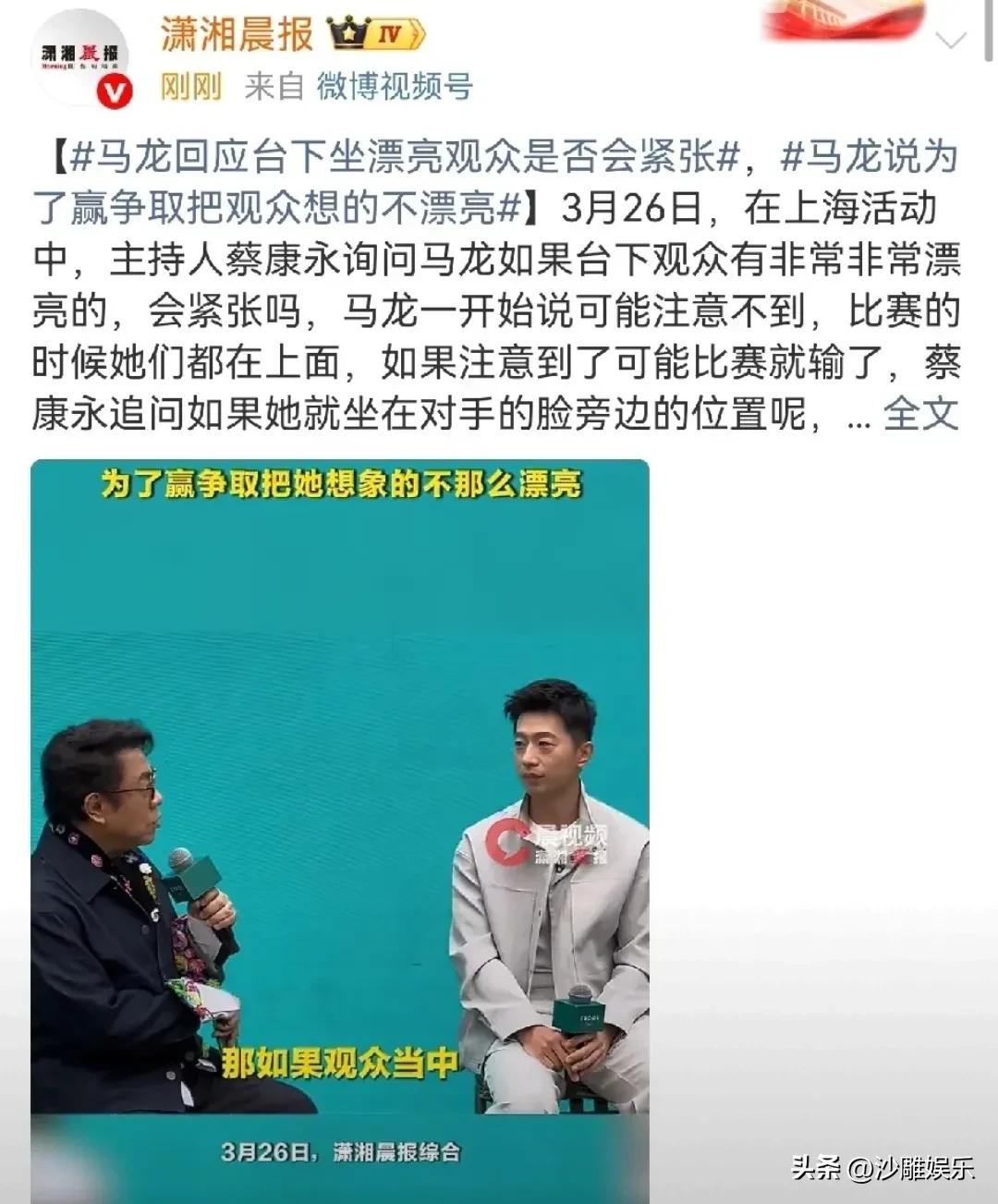 马龙,又说大实话了! 3月26日傍晚,上海一场活动上,蔡康永老师带着他那标志性的“坏笑”,给马龙挖了一个“坑”。本以为龙队会一如既往地滴水不漏,结果——正经不过三秒,最后那句大实话,直接把全场笑翻了。 事情的起因很简单。蔡康永笑眯眯地问马龙:“要是台下坐着特别漂亮的观众,你打球会紧张不?” 这个问题,多少带点“挖坑”的意味。换做一般人,要么尬聊,要么客套两句。可马龙是谁?双圈大满贯得主,什么大场面没见过。他先是乐了,然后一本正经地接招:“比赛的时候,观众都在看台上呢,我哪有那功夫注意。真要注意到了,那这场比赛估计就得输了。” 听听,这话说得既得体又严谨——不是不想看,是真没空看,看了就得输。职业运动员的肌肉记忆和专注力,一下子就立住了。 可蔡康永哪肯轻易放过他,紧接着补了一刀:“要是她就坐在你对手脸旁边,你一抬头就能看着呢?” 这个问题角度刁钻,堪称“灵魂拷问”。全场目光都聚在马龙身上,等着看他怎么接。 马龙这下彻底“放飞”了,笑着回了一句:“那我就得争取把她想象得没那么漂亮,不然赢不了球啊!” 话音刚落,全场爆笑。这句话看似是玩笑,实则是一句“大实话”——为了赢球,连自己的视觉感知都能“手动干预”,这种极致的专注力,真不是一般人能做到的。 了解马龙的人都知道,他打球时那股专注劲儿,说是“钉在球台上”都不夸张。别说台下坐个漂亮观众了,就是天上下刀子,他眼里也只有那个白色的小球和对手的每一个动作。 对马龙而言,赛场上每一分都是抠细节抠出来的。什么“视觉干扰”“心理波动”,在他这儿统统被屏蔽在外。这种为了赢球连“自我催眠”都用上的劲儿,不正是他能从那么多高手中杀出来、成为乒乓传奇的原因之一吗? 说实话,这段对话之所以能出圈,表面看是马龙被“套路”出了幽默感,内里折射的,却是顶级运动员与普通人之间那道看不见的“专注力鸿沟”。 普通人看比赛,看的是热闹、是颜值、是戏剧性;但运动员站在赛场上,每一秒都是真刀真枪的博弈。马龙那句“想象得没那么漂亮”,听着是玩笑,背后是十几年如一日的职业本能——在胜负面前,所有干扰项都必须被自动“打码”。 这就是马龙。你可以说他“不解风情”,但你不得不服他这份“轴”。在他心里,赢球永远是第一要务,再美的风景,也得先靠边站。 而这,大概就是为什么,他能成为那个让所有人都服气的“龙队”吧。