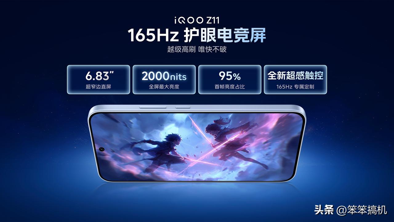 iQOO Z11提供「沧浪浮光」、「天光白」、「极夜黑」三款配色,外观采用悬浮舷窗设计、大R角和视觉四等边设计。搭载iQOO首款165Hz护眼电竞屏,6.83英寸超窄边直屏,全局最大亮度2000nits。