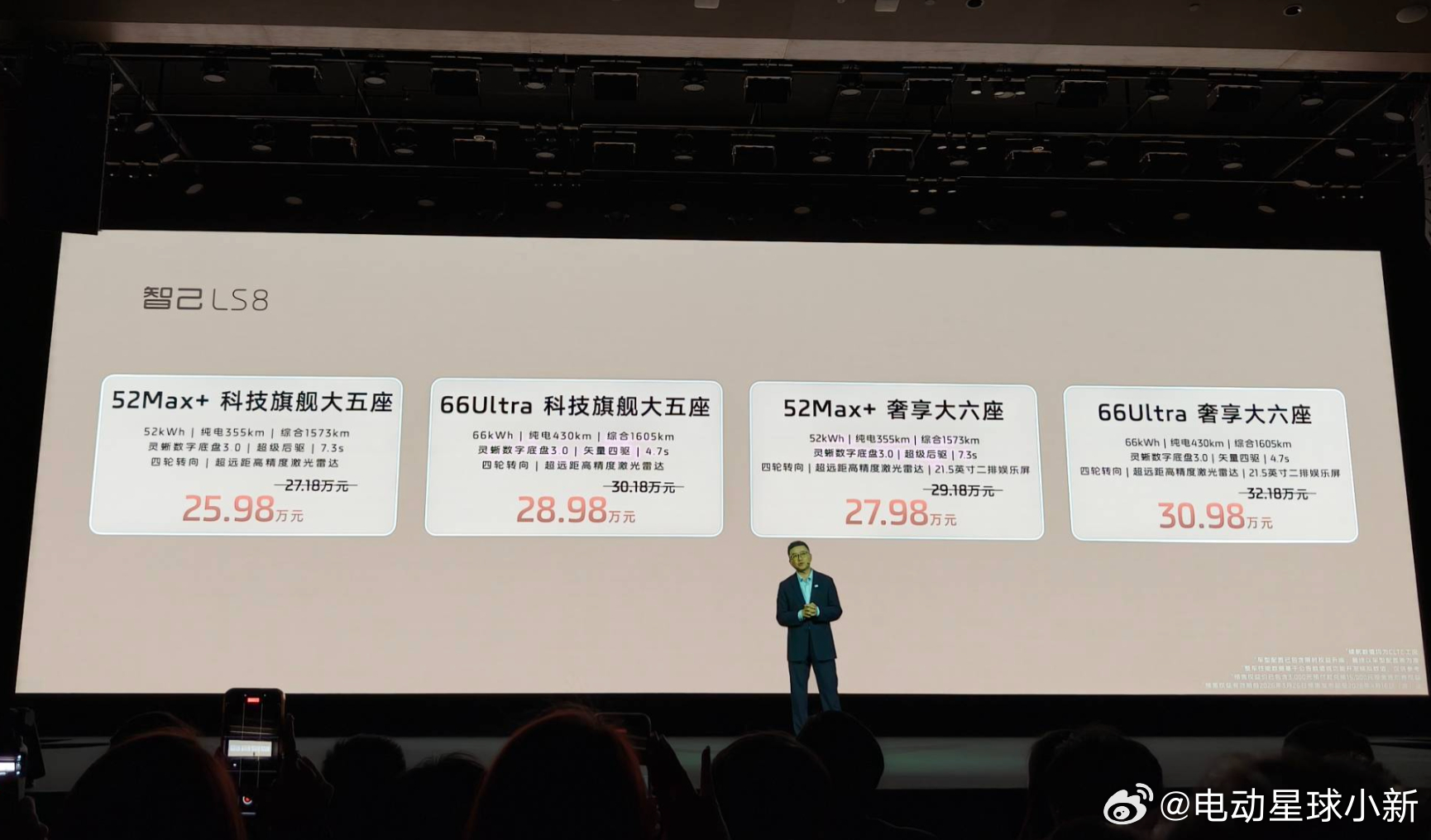 大五座后驱 52kWh 版本(Max+)预售权益价 25.98 万元,六座版本(Max+)为 27.98 万元;大五座 66kWh 四驱版本(Ultra) 28.98 万元,六座版本(Ultra) 30.98 万元。