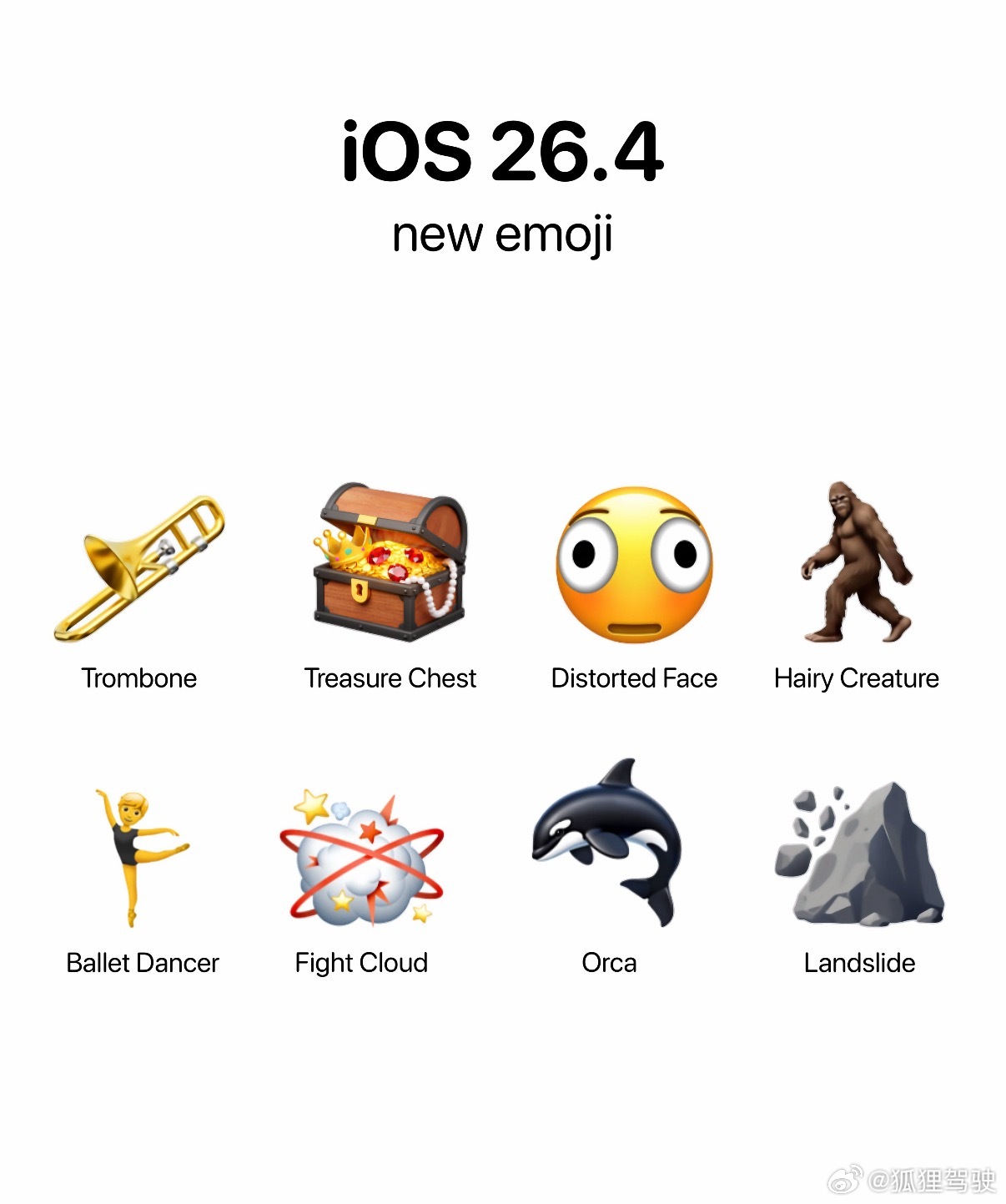 苹果 iOS 26.4 发布的新emoji 表情分别是长号宝箱扭曲的脸毛茸茸的生物战斗云虎鲸山体滑坡