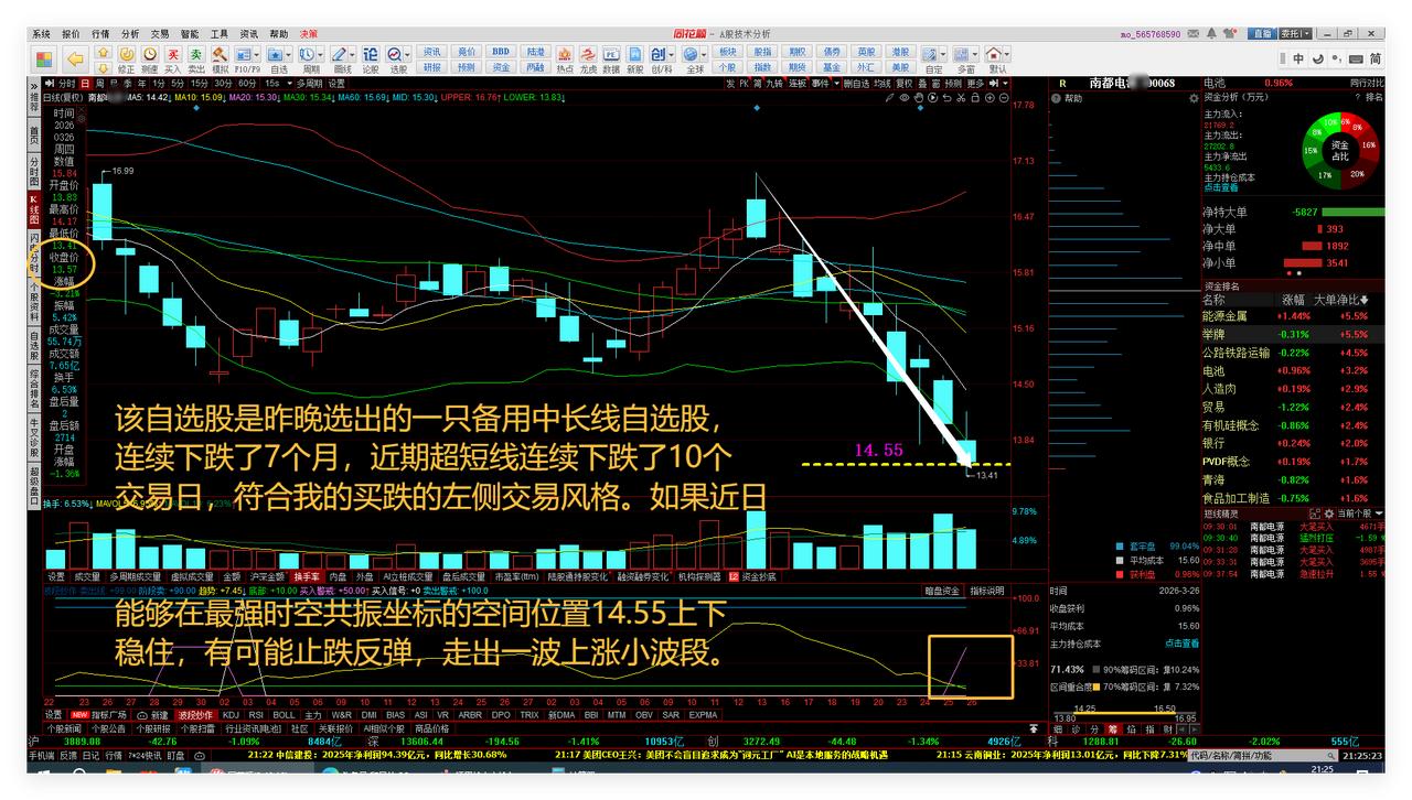 A股大盘超短线技术回踩后,仍有一波反弹性质的上涨小波段。 经过分析,我觉得,接下来上证综指仍有向下回调空间,有可能在3885点、3855点或3825点附近止跌反弹,时间看本周五或下周一、周二吧。最快结束下跌就是明天、即本周五了。所以,今天收盘前进了一点货。敬请参阅附图1。 另外,上一篇微头条中缺少的图片是南都DY吧。 该自选股是昨晚选出的一只备用中长线自选股,连续下跌了7个月,近期超短线连续下跌了10个 交易日,符合我的买跌的左侧交易风格。如果近日能够在最强时空共振坐标的空间位置14.55上下 稳住,有可能止跌反弹,走出一波上涨小波段。敬请参阅附图2。