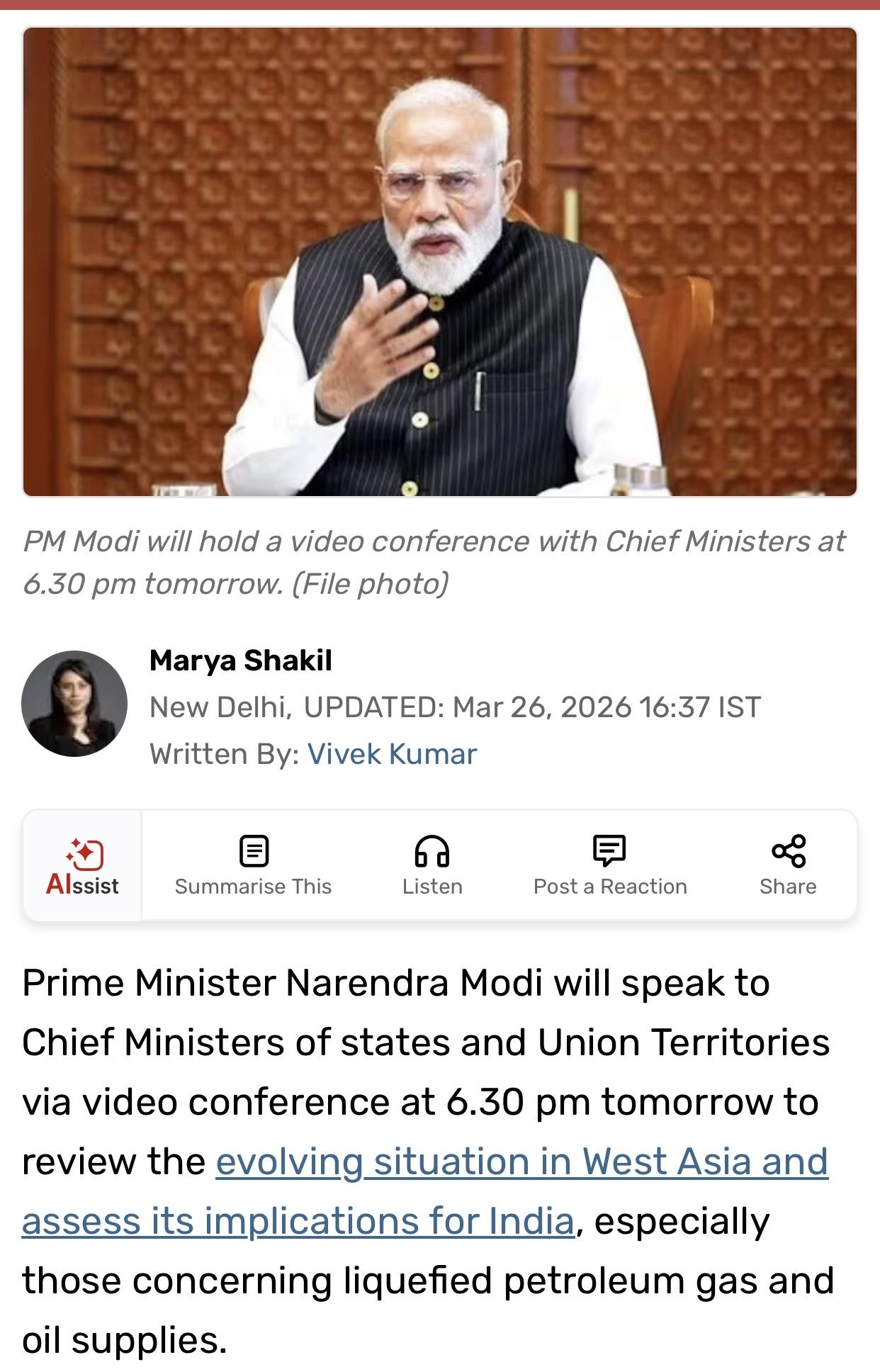 印媒:总理莫迪明日举行邦府负责人会议讨论能源安全问题 印度《今日印度》官网3月26日报道:印度总理莫迪将于明天下午6点30分通过视频会议与各邦和联邦直辖区首席部长进行讨论,审视西亚不断变化的局势,并评估对印度的影响,特别是与液化石油气和石油供应有关的影响。 报道说,会议将重点关注准备措施,包括供应链、能源安全和印度海外公民的安全。 报道说,总理强调协调行动,预计将强调本着“印度队”精神(the spirit of "Team India”)采取集体反应的重要性,确保中央和各邦之间的密切合作。 报道说,鉴于印度面临液化石油气短缺、印度家庭的基本燃料供应受到削弱,这次会议具有重大意义。伊朗对大多数国家封锁了霍尔木兹海峡,尽管不包括印度,但仍然引起人们对未来可能艰难日子的担忧。 报道说,尽管西亚紧张局势加剧,但今天政府仍向公民保证,目前不存在迫在眉睫的风险,印度仍有60天的燃料供应,并敦促人们不要相信有关燃气短缺的猜测。政府证实,该国的能源供应仍然稳定且管理良好,有充足的储备以满足当前的需求。 据印度石油和天然气部称,已经安排了大约两个月的原油运输时间。而公共部门印度石油营销公司提前锁定了进口,以确保供应的连续性。即使人们对霍尔木兹海峡的破坏感到担忧,印度仍可继续从40多个国家的多样化网络采购原油,这减少了对任何单一路线或地区的能源依赖。 报道说,官员们强调,国内炼油厂正以超满负荷的产能运行,有助于保持全国燃料供应的稳定。印度的总体储存能力可满足约74天的消费需求,而包括战略石油储备在内的现有库存水平,目前可满足近60天的消费需求。 报道的原标题是《PM to speak to Chief Ministers tomorrow to review preparedness amid Iran war》(总理将于明日与各邦首席部长会谈,评估伊朗战争期间的储备情况)。