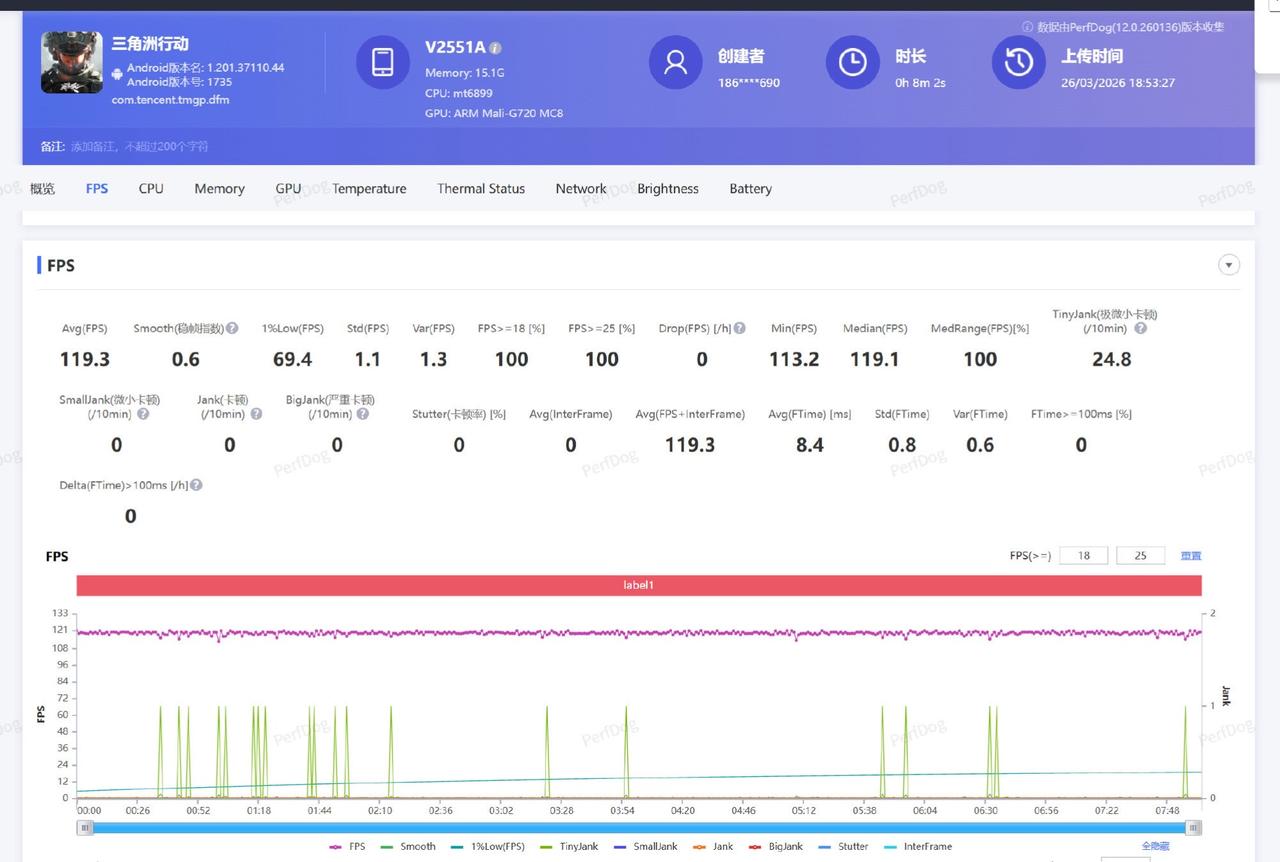 拿到手的第一反应就是这后盖颜值有点高。 配置方面这次也是该给的都尽可能拉满了天玑8500处理器安兔兔跑分可以达到262万,跑满《王者荣耀》144FPS模式无压力,我还试了一下《三角洲行动》120FPS模式,帧率也很稳定(图7)。 屏幕方面是肉眼可见的高素质,1.5K 165Hz全屏亮度2000nits基本上是这个价位段屏幕的天花板了。 这次最大的卖点是高达9020mAh的大电池,是目前为止蓝厂电池容量最大的手机。这个电池搭配天玑8500这个级别的SOC,续航水平就不用过多废话了,用四个字形容就是“恐怖如斯 ”。 价格方面看最后一张图,在存储价格暴涨的情况下,虽然是塑料边框,但这配置给到1999起还是很可以了。
