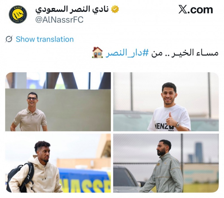 利雅得胜利官推写道:“晚上好…来自利雅得胜利之家的问候。”