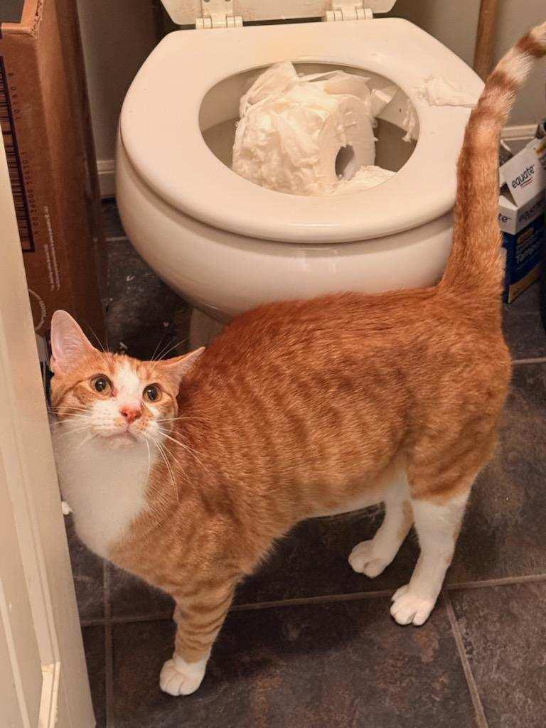 有只猫把整卷卫生纸叼进马桶,还一脸得意。最绝的是,它居然会自己掀开马桶盖——这聪明劲儿全用在了捣乱上。