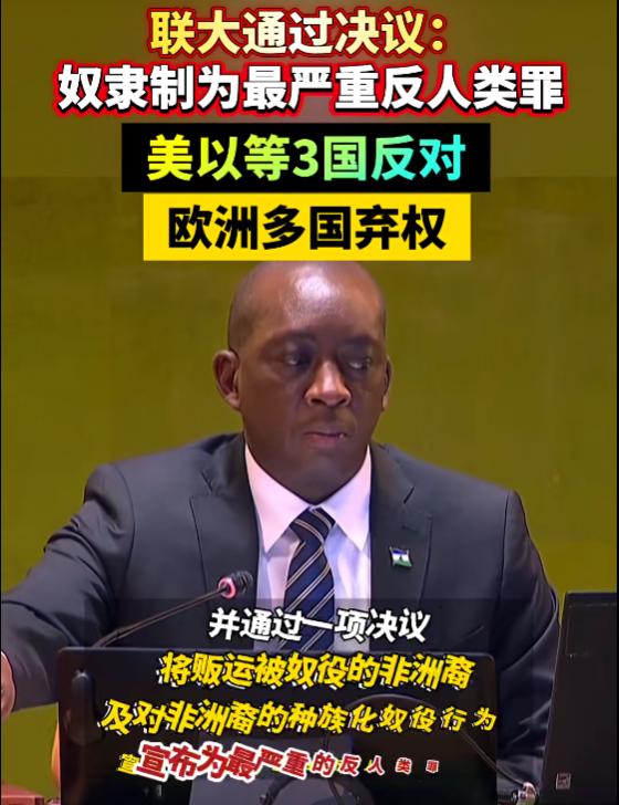 联大这张投票表,扒光了西方 “人权祖师爷” 的底裤! 3 月 25 日,联合国大会高票通过历史性决议,正式将跨大西洋贩卖奴隶、种族化奴役行为定性为最严重的反人类罪,要求相关国家道歉、归还被盗文物、落实赔偿,根除种族主义余毒。 投票结果堪称本世纪最大的人权讽刺现场:123 票赞成,中、俄、印、巴等绝大多数国家站在历史正义一边;仅美国、以色列、阿根廷 3 票反对;英法德意等几乎所有欧洲国家,连同日本在内共 52 票弃权。 我只想问:天天把人权焊在嘴上的西方,你们的人权到底是什么? 持续 400 年的跨大西洋奴隶贸易,是人类史上最黑暗的集体反人类罪行。1500 万非洲人被像牲口一样塞进贩奴船,超三分之一惨死航程,活下来的人被剥夺人格、世代沦为私产,在鞭打与虐杀中度过一生。而这场罪行的始作俑者、最大受益者,恰恰就是今天投下反对票和弃权票的西方国家。 更可笑的是他们的遮羞布借口:美国称 “当代人不该为几百年前的错误负责”,拒绝承担赔偿义务;欧洲国家辩称 “反人类罪不该分等级”,不认可 “最严重” 的表述。 这副双标嘴脸简直不堪入目!你们逼着德国为纳粹罪行年年道歉赔偿、立法禁止任何翻案言行时,怎么不说 “不该为历史负责”?怎么不说 “罪行不该分等级”?德国能被世界原谅,是因为真道歉、真反思、真赔偿,而你们连给这段罪行定性都不敢,还有脸自称 “人权卫士”? 美国的反对是明着坏:它的发家史就是一部黑奴血泪史,至今根深蒂固的种族歧视,根源就是从未被彻底清算的奴隶制。连反对奴隶制的文明底线都守不住,谈何人权? 欧洲的弃权是极致虚伪:当年的贩奴头号玩家,不敢认账怕面对巨额赔偿诉求,又不敢公开反对怕撕烂 “人权灯塔” 的伪装,只能缩着头弃权,连直面历史的勇气都没有。 这项决议,是全球南方国家为几千万惨死黑奴讨回的迟到公道。人权从来不是西方的地缘政治武器,它的底线,是直面历史、承认罪行。连这条底线都守不住,所有的人权口号,都不过是自欺欺人的笑话。 你觉得西方国家该为奴隶制历史道歉赔偿吗?评论区聊聊你的看法。