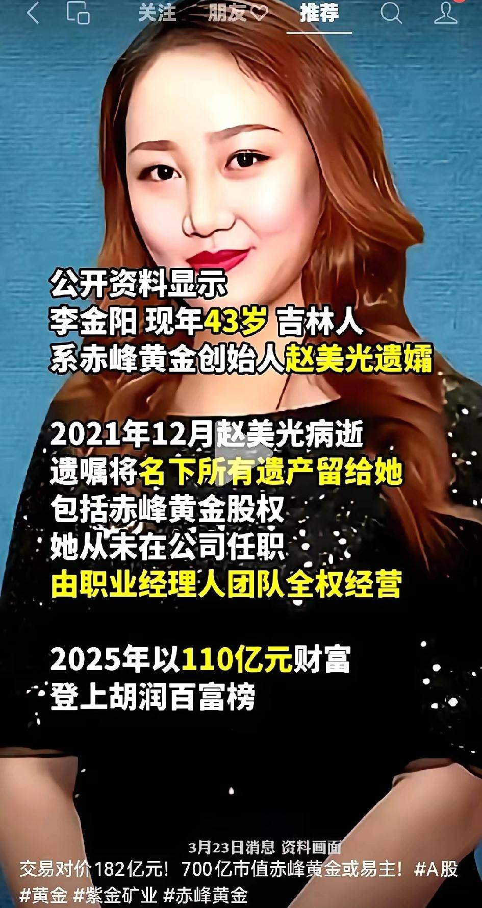 紫金矿业这公司,真有点东西。 18个高管,人均年薪599万。这数字,砸在桌上都能听见响。 我本来以为这就够夸张了,直到他们扭头全额收购了赤峰黄金。 这一下,真正的主角才登场。 这笔交易对价高达182亿元,对应赤峰黄金约700亿元的市值,紫金矿业拿出真金白银,要将这家深耕黄金领域多年的企业彻底纳入麾下。而这场资本运作里,最牵动市场目光的,从来不是紫金矿业的大手笔,而是站在交易另一端的李金阳。 公开资料里的李金阳,43岁,吉林人,身份是赤峰黄金创始人赵美光的遗孀。2021年12月,赵美光因病逝世,一份遗嘱将他名下所有遗产,包括赤峰黄金的核心股权,全部留给了李金阳。 她从未在赤峰黄金担任过任何职务,没有参与过一次公司的经营决策,日常运营全靠职业经理人团队全权打理,却靠着这份继承的资产,在2025年以110亿元的财富登上胡润百富榜,成为资本市场里备受关注的“躺赢”富豪。 不少人盯着她的财富数字议论纷纷,觉得她没付出半点努力,就坐拥百亿资产,是命运的偏爱。可没人能忽视,这份财富的根基,是赵美光半辈子打下的商业版图,是职业经理人团队多年来的稳定运营 才让这份遗产在波动的资本市场里保值增值,甚至成长为能吸引行业巨头主动收购的优质资产。她的“躺赢”,从来不是凭空而来,而是站在前辈的肩膀上,靠着成熟的管理模式,守住了这份沉甸甸的家业。 再看紫金矿业这边,18位高管人均近600万的年薪,曾让不少人诟病“高薪割韭菜”,可这场182亿的收购,恰恰打了那些质疑者的脸。能拿出这么大一笔资金完成全额收购,足以证明紫金矿业的现金流和盈利能力足够强劲 高薪背后,是公司对核心管理人才的绑定,是对职业经理人价值的认可,也正是这份稳定的管理架构,让紫金矿业有底气在行业里大举扩张,一步步巩固自己的行业地位。 这场收购从来不是简单的企业并购,而是黄金行业格局的一次重新洗牌。紫金矿业吞下赤峰黄金之后,将直接掌握更多的黄金资源储备 在国内乃至全球黄金市场的话语权都会进一步提升,而李金阳也将在交易完成后,从持有股权的产业富豪,转变为手握百亿现金的资本方,未来的每一步选择,都会继续牵动资本市场的神经。 有人会觉得,李金阳的存在是资本市场的特例,是“嫁得好”的典型,可放在更宏观的视角里,她的经历恰恰反映了现代企业治理的一种可能——创始人离世后,只要有成熟的职业经理人体系,企业依然能稳定运转,遗产也能得到妥善的管理和增值。 而紫金矿业的高薪和收购,也让人们看到,优质的企业从来不怕给人才开高价,只要能换来持续的发展和扩张,高薪就是最划算的投资。 这场交易里,没有谁是绝对的受益者,也没有谁是无辜的旁观者。紫金矿业拿到了想要的资源,李金阳兑现了继承的财富,职业经理人团队完成了守护企业的使命 整个黄金行业也在这样的整合中,朝着更集中、更高效的方向迈进。它打破了人们对“继承人必须懂经营”的固有认知,也打破了“高管高薪就是掏空公司”的偏见,用实打实的资本运作,告诉所有人,现代商业的玩法,早已超出了传统的想象。 各位读者你们怎么看?欢迎在评论区讨论。