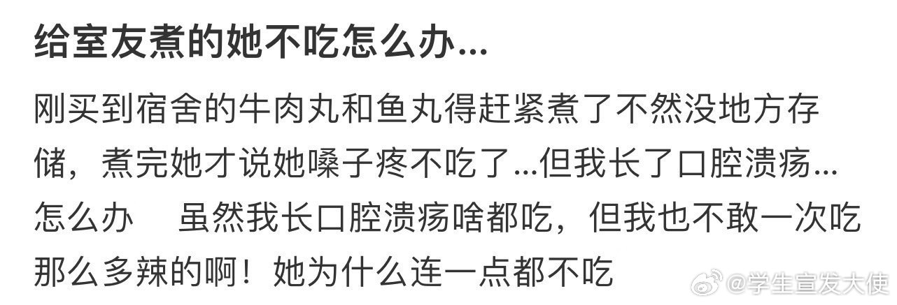 怎么就变成给室友煮的了?她让你买的?让你煮的?她事先知道并同意你煮辣的?室友不是你的厨余垃圾桶哈