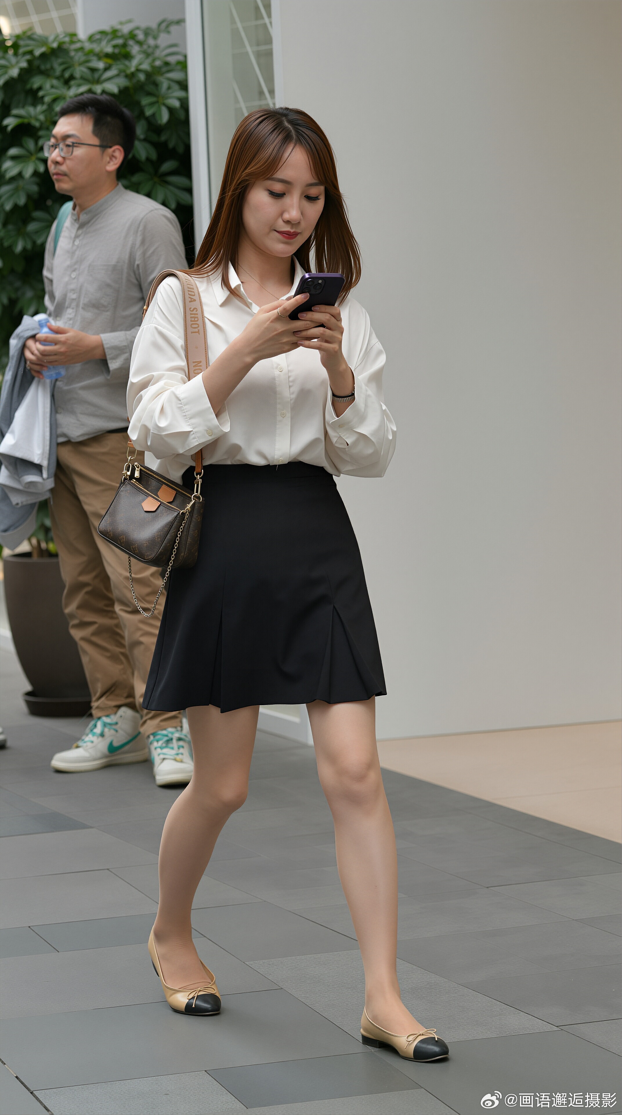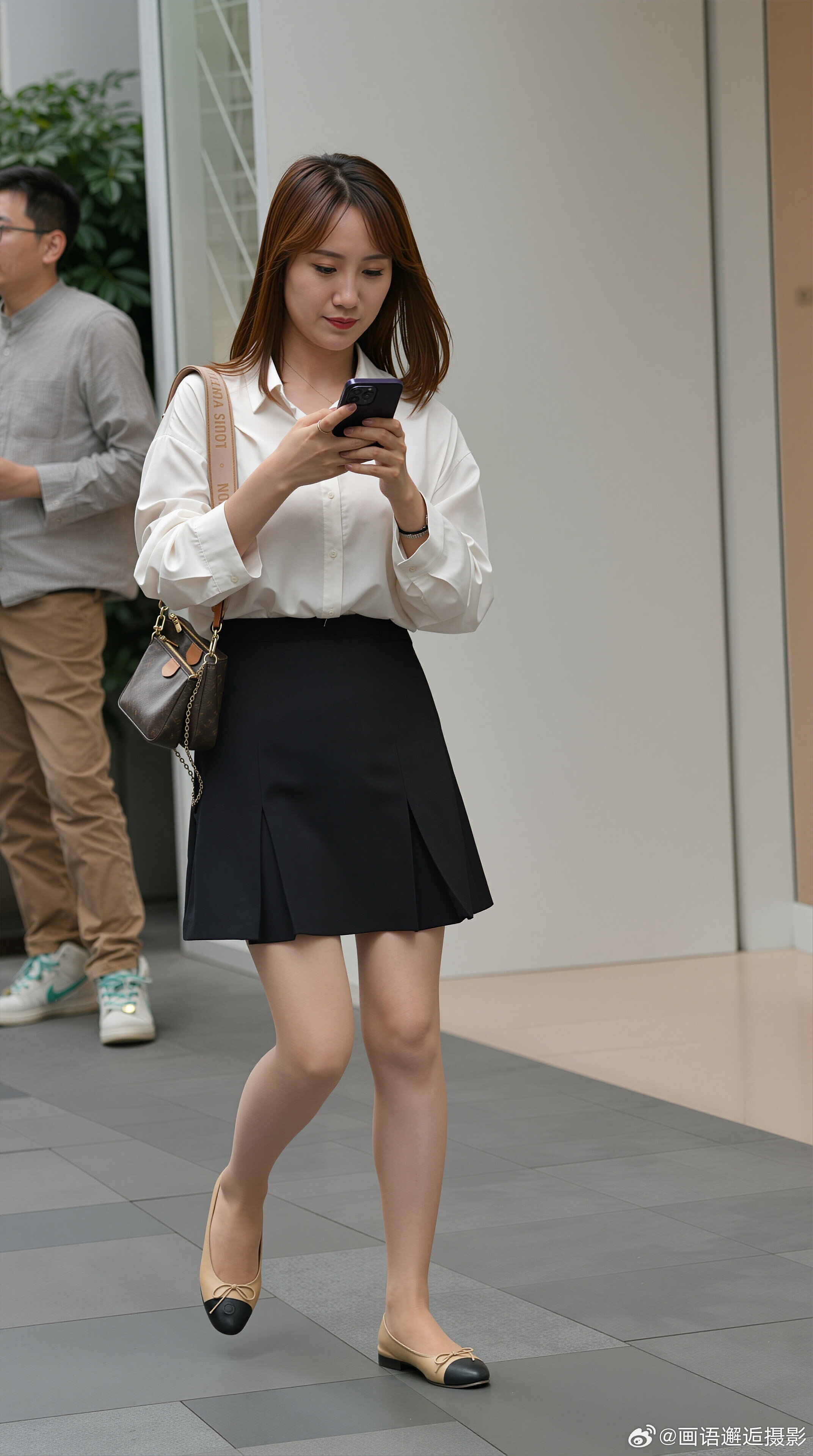 发现你的魅力 白色衬衫搭配黑色百褶短裙,简约干练又不失优雅,脚踩拼色芭蕾舞平底鞋,手提经典老花包,通勤出街两不误,轻松演绎都市女性的知性魅力。