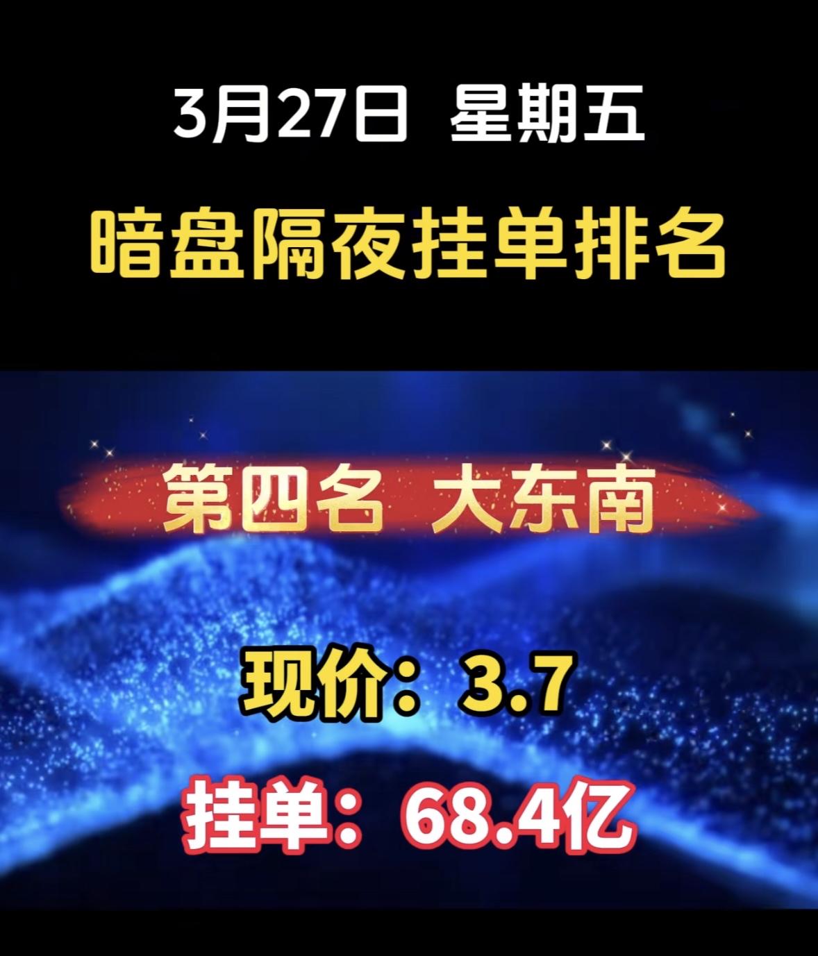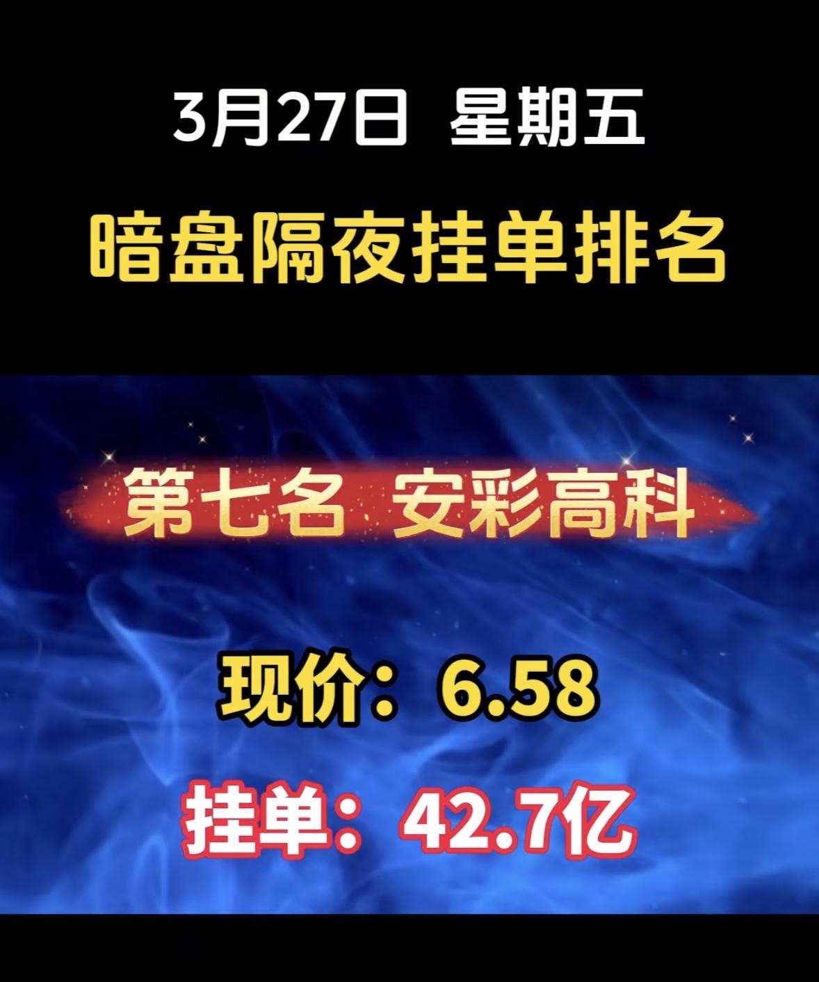 3月27日周五暗盘隔夜挂单排行榜出炉 安彩高科这波操作太猛了!暗盘隔夜挂单排名第七,挂单金额高达42.7亿,现价6.58,感觉要强势起飞。3月26日10点4分它就触及涨停板,所属光伏设备行业虽下跌,但它成了领涨股,还是光热发电、国企改革、玻璃概念热股。 盘后龙虎榜数据很有看头,买入方面,沪股通专用席位最积极,买了2208.65万元,还有量化资金代表开源证券西安西大街营业部也买了不少。卖出方面,申万宏源河南分公司又买又卖,卖出最多。这多空博弈激烈,安彩高科后续走势很值得期待!