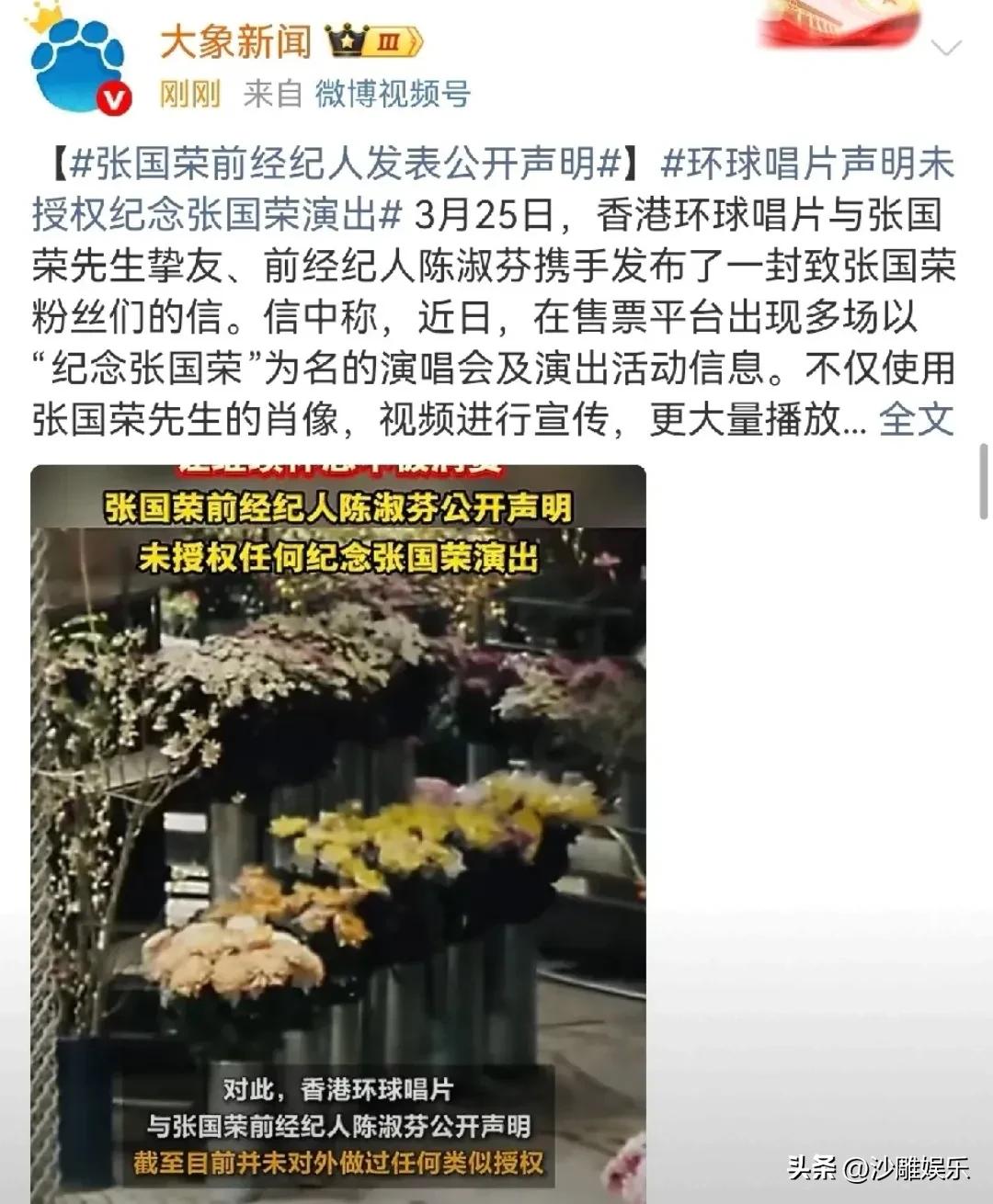 张国荣前经纪人,严肃发文! 3月26日,张国荣前经纪人陈淑芬突然冲上热搜,原因不简单——她和香港环球唱片联手给粉丝写了封信。信的内容一曝光,评论区直接炸了锅。 这封信到底写了啥?一句话概括:别拿“哥哥”当摇钱树! 原来,最近各大售票平台上突然冒出了一堆“纪念张国荣”的演唱会,宣传海报上张国荣的肖像、视频用得那叫一个顺手,经典曲目更是照单全唱。但陈淑芬和环球唱片的态度很硬核:这些演出,我们压根没授权过! 信里还直接撂下狠话——未经许可用张国荣的肖像、姓名搞商业宣传,涉嫌违法!唱他的歌、用他的演出视频,没拿到版权方授权,通通属于侵权。 说实话,这封信之所以能冲上热搜,不是因为“维权”本身有多稀奇,而是它精准戳中了一个让无数粉丝又爱又恨的现象:情怀这门生意,到底有没有底线? 张国荣“哥哥”这个名号,不是白叫的。他的作品、他的人格魅力,圈粉几代人,直到今天,每年4月1日前后,文华东方酒店门口的花海还是能让人破防。但偏偏就是这份沉甸甸的怀念,成了一些人眼中的“流量密码”。 细数这些年的操作,真是一个比一个离谱——山寨纪念展、盗版周边、打着“纪念”旗号的高价晚宴……现在又来了个“挂羊头卖狗肉”的演唱会。宣传打得比正主还响亮,票卖得比谁都积极,结果呢?从头到尾跟张国荣家人、前经纪公司、版权方没半毛钱关系。 更扎心的是,信里那句话说得明明白白——未经授权就是侵权,这已经不是“情怀”的问题了,是法律问题。 其实这封信的意义,远不止“辟谣”这么简单。它给粉丝吃了颗定心丸,也给那些想蹭热度捞钱的人敲了一记警钟:别以为打着“纪念”的旗号就能为所欲为,张国荣的名字,不是谁想用就能用的。 说到底,真正的怀念从来不需要靠一场山寨演唱会来证明。那些愿意在4月1日静静听一首《玻璃之情》的人,那些还会在文华酒店门口放一束白玫瑰的人,他们心里装着的“哥哥”,从来不是用来变现的流量。 陈淑芬这封信,撕开的是一场“情怀生意”的遮羞布。愿以后每一场纪念,都干干净净。