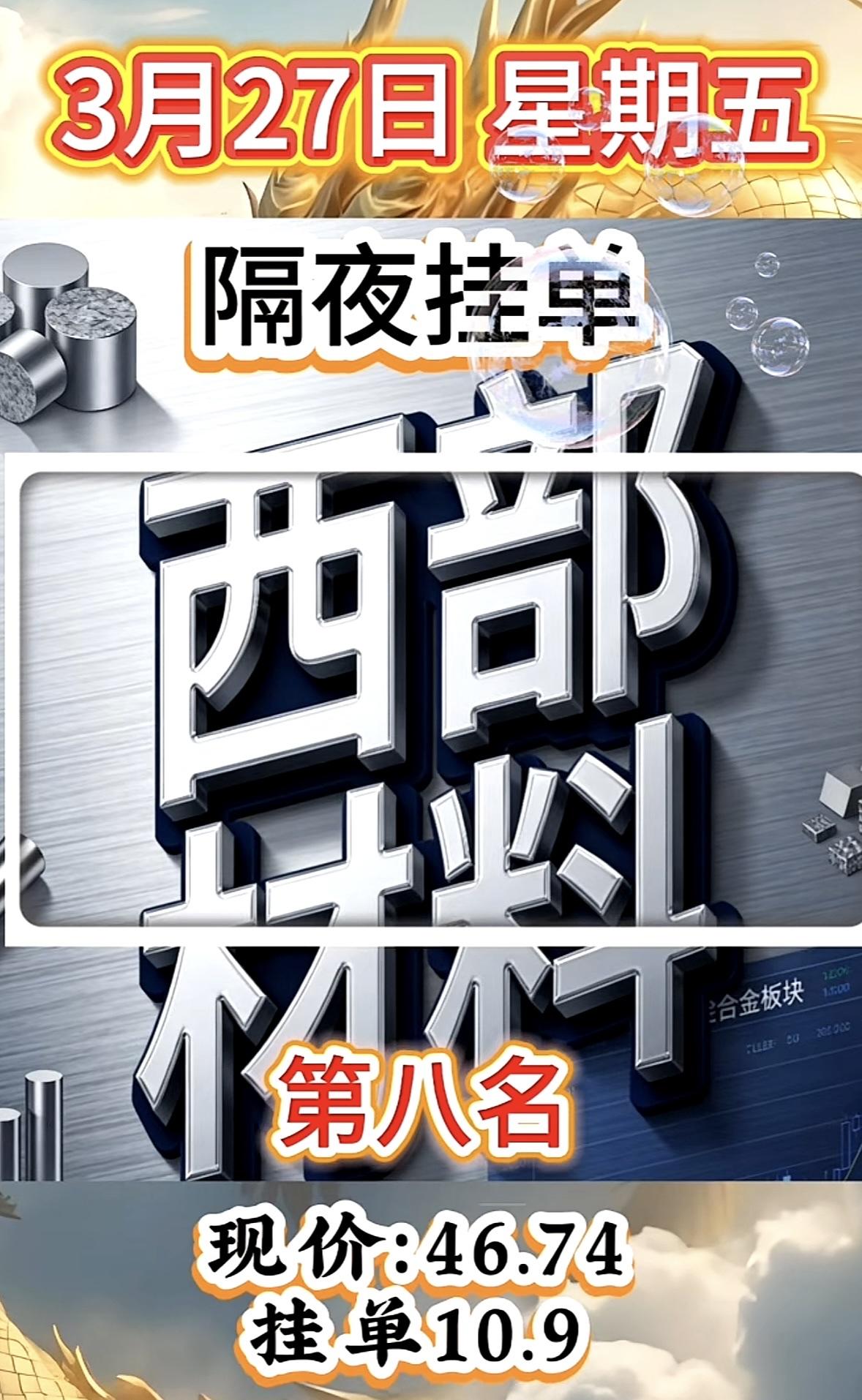 3月27日周五暗盘隔夜挂单排行榜出炉 西部材料这隔夜挂单整得有点猛啊!现价46.74,居然挂了10.9亿的单。这手笔,一看就有大资金在里面搞事情。这么大的隔夜挂单量,肯定会对股价后续走势产生不小的影响。说不定明天一开盘就会有大动静,要么是大幅高开,吸引一堆跟风盘;要么就是主力借此洗盘,把不坚定的筹码震出来。不过这10.9亿的单子背后到底是谁在操作,又怀着怎样的目的,还真不好说。只能等着看后续市场的反应了,感觉有一场好戏要开场咯。