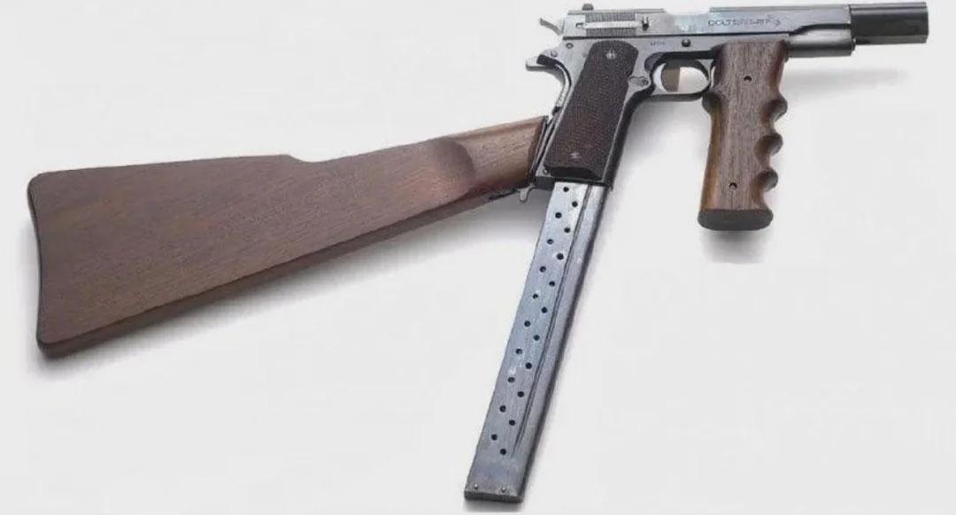 [呲牙] 美国的“手搓风”——“莱伯曼风格”。海曼・索尔・莱伯曼,他当年因为曾给大盗约翰・迪林杰提供自动武器而出名。莱伯曼特别喜欢各种改装,而且改得相当另类。他会把半自动武器改成全自动,包括手枪。结果就造出了些怪模怪样的东西 —— 看着像手枪,其实已经是冲锋手枪了。 莱伯曼尤其喜欢折腾柯尔特 M1911,大家看图1,这支 M1911 加装了前握把和枪托,前握把还贴心地加工出指槽,枪托也进行了减重;另外还给配上超长的弹匣,看上去真的难以形容。 不过,这样的武器在地下市场还挺抢手,二战时美军军官和特工也会私下找他进行改装(参见图2)。 注:约翰・赫伯特・迪林杰(John Herbert Dillinger,1903.6.22—1934.7.22),美国大萧条时期中西部著名银行劫匪,迪林杰帮头目。1933 年假释出狱后,率团伙在约一年间抢劫 24 家银行、4 座警局,两次成功越狱(其中一此用涂了鞋油的木刻假枪越狱),多次与警方枪战,被 FBI 列为头号公敌FBI。1934 年 7 月 22 日,他在芝加哥比沃格拉夫剧院外遭 FBI 特工伏击击毙,年仅 31 岁(当时他居然用假名在一家银行上班)。其犯罪经历成为美国 “全民公敌时代” 的标志性事件。
