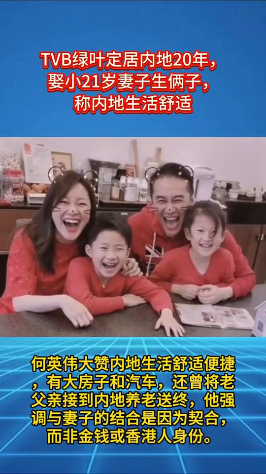 TVB绿叶定居内地20年,娶小21岁妻子生俩子,称内地生活舒适。 61岁TVB资深绿叶何英伟已淡出娱乐圈,20年前移居内地经商,2011年二婚娶小21岁的内地妻子,两人育有两个儿子,一家四口生活幸福,他直言不打算返回香港。 何英伟大赞内地生活舒适便捷,有大房子和汽车,还曾将老父亲接到内地养老送终,他强调与妻子的结合是因为契合,而非金钱或香港人身份。
