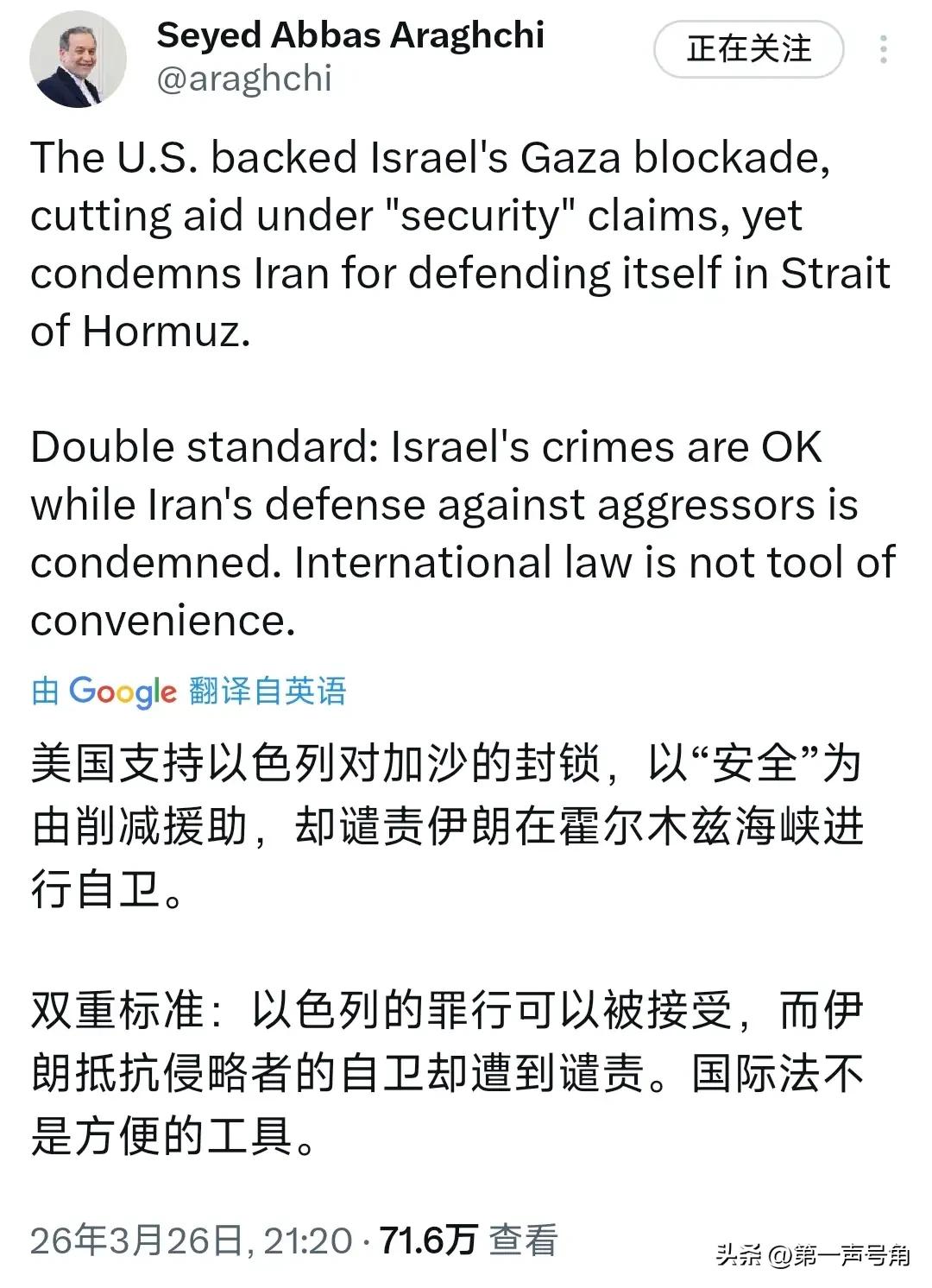 伊朗外长阿拉格齐昨晚(北京时间3月26日晚)写道:“美国支持以色列对加沙的封锁,以“安全”为由削减(对加沙的)援助,却谴责伊朗在霍尔木兹海峡进行自卫。双重标准:以色列的罪行被容忍,而伊朗抵御侵略者的防卫行为却被指责。国际法不应成为随意使用的工具。” 评几句 阿拉格齐的质问,戳破了谁的"规则遮羞布"? 伊朗外长阿拉格齐深夜发声,一句"国际法不应成为随意使用的工具",道破了当今国际政治最荒诞的现实。 且看这双标有多离谱: 以色列对加沙实施海陆空全面封锁,切断200万平民的生命通道,美国选择性失明,甚至以"安全"为由削减人道援助;而伊朗在自家门口——霍尔木兹海峡进行防御性军事部署,却被华盛顿群起攻之,扣上"威胁航行自由"的帽子。 更讽刺的是法理逻辑。 以色列的封锁被美媒包装成"反恐必要措施",伊朗的防卫却被定性为"地区不稳定因素"。同一套《联合国宪章》,在华盛顿手里成了橡皮泥——捏扁搓圆全凭地缘利益。这种"我的盟友无罪,我的对手有罪"的审判标准,让国际法彻底沦为强权政治的遮羞布。 阿拉格齐的愤怒,实则代表了全球南方国家的集体憋屈:当规则制定者率先破坏规则,"基于规则的国际秩序"不过是霸权维护特权的工具箱。 加沙的断壁残垣与霍尔木兹的剑拔弩张,正在同一面镜子中映照出这个时代的荒诞。