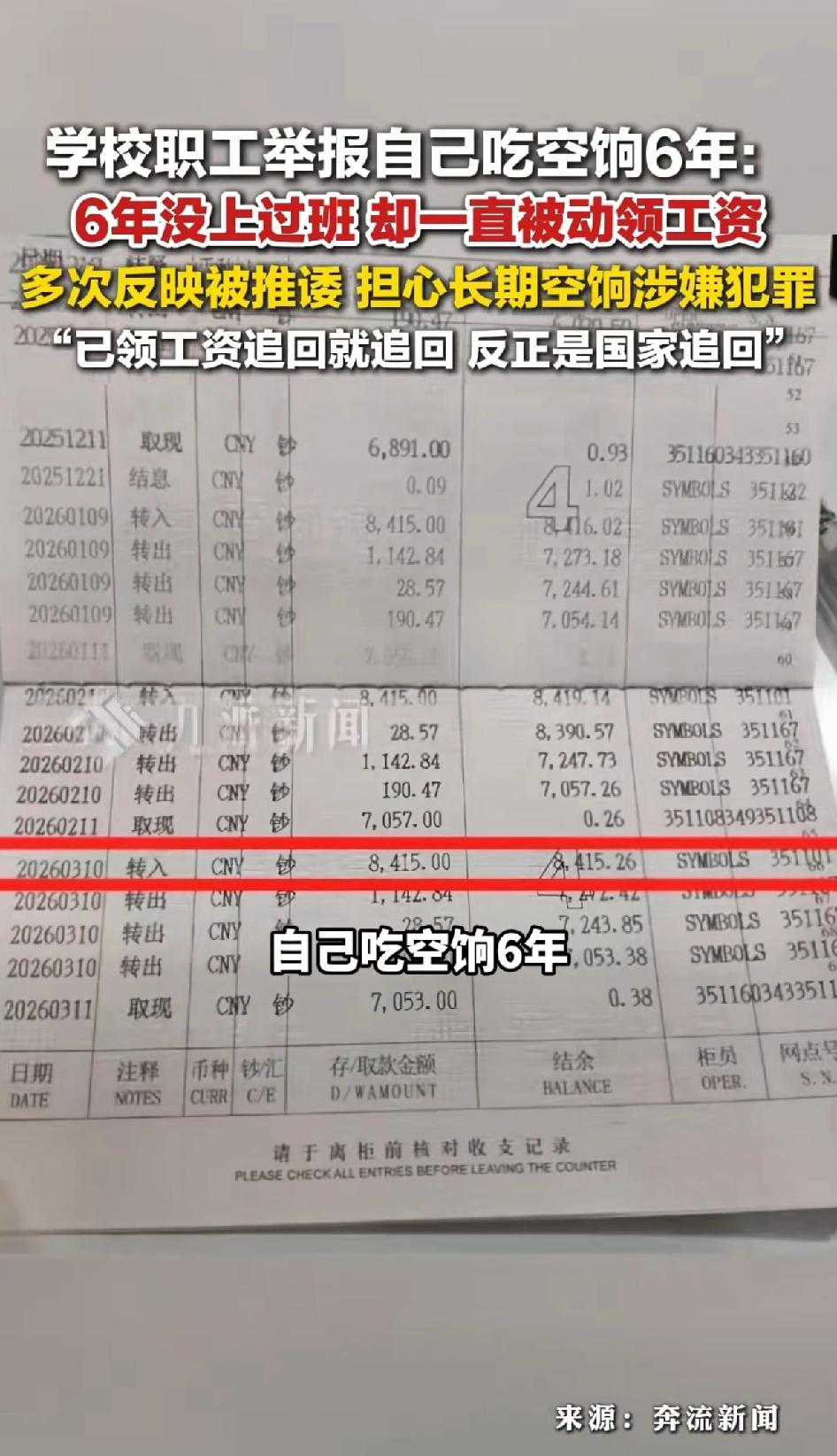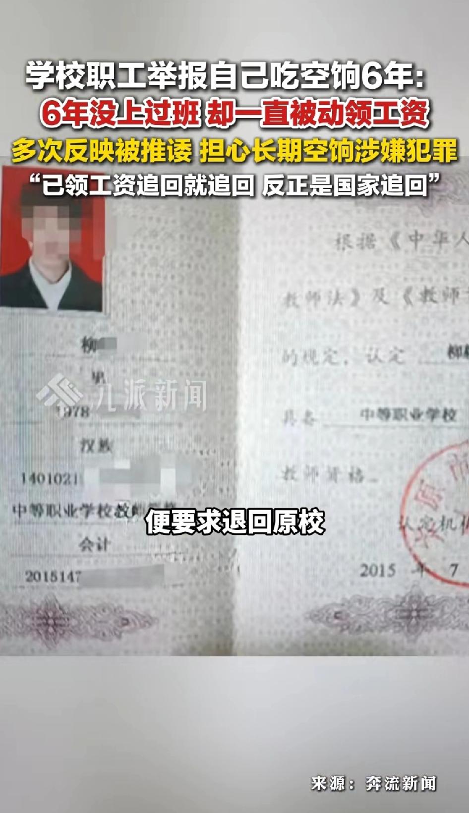 学校职工举报自己吃空饷6年:6年没上过班,却一直被动领工资。多次反映被推诿,担心长期空饷涉嫌犯罪 山西太原的柳先生举报自己吃空饷6年,这事儿太离奇了。2019年12月他从山西省贸易学校调入太原二十九中,发现调动程序有问题,比如审批盖章空白、先批准后请示等。上了一个月班后,他就没再到岗,开始要求回原校。 这6年他没上班,工资却从3千涨到7千。他多次找相关部门,还把人社、教育部门告上法庭,向纪委举报自己,但问题依旧没解决。学校称是“人文关怀”没辞退他,教育局还在调查。柳先生怕担刑事责任才举报,愿意退还工资。这事儿暴露出监管漏洞,希望能尽快有个公正的处理结果。