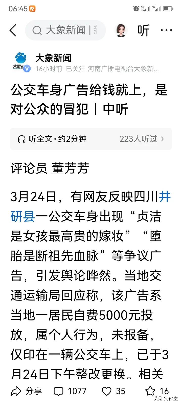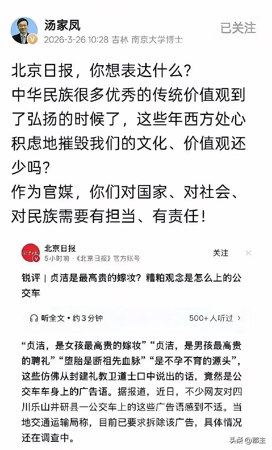 公交上的广告争议显然已经分两个阵营,一个是“捞女”“三通一达”部分主流媒体的反对。一个是大部分的男性和一些男性大V的支持。 反对的人无非就是她们做不到,这条广告动了她们的利益,只能她们要求别人如何,人家要求她们的最基本,最底线的要求都做不到。 这不是只呼吁女性要守住“贞洁”,同样也在呼吁男性也要自爱,怎么就会惹众犯呢?