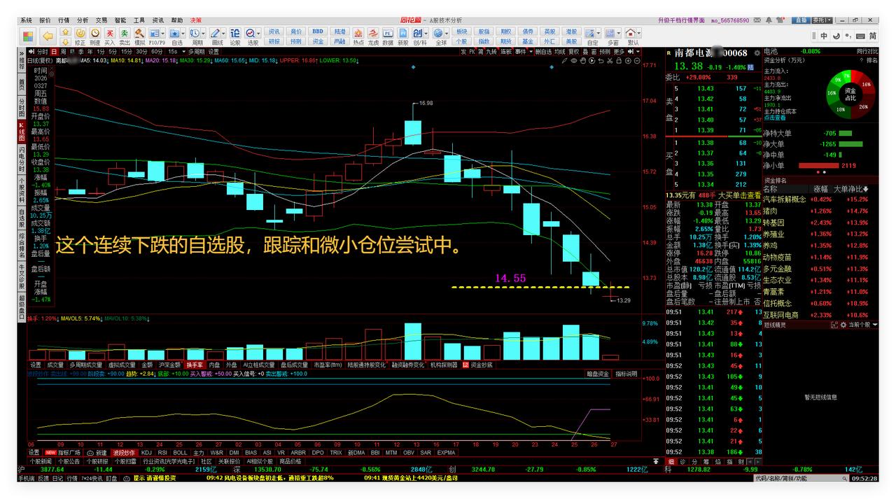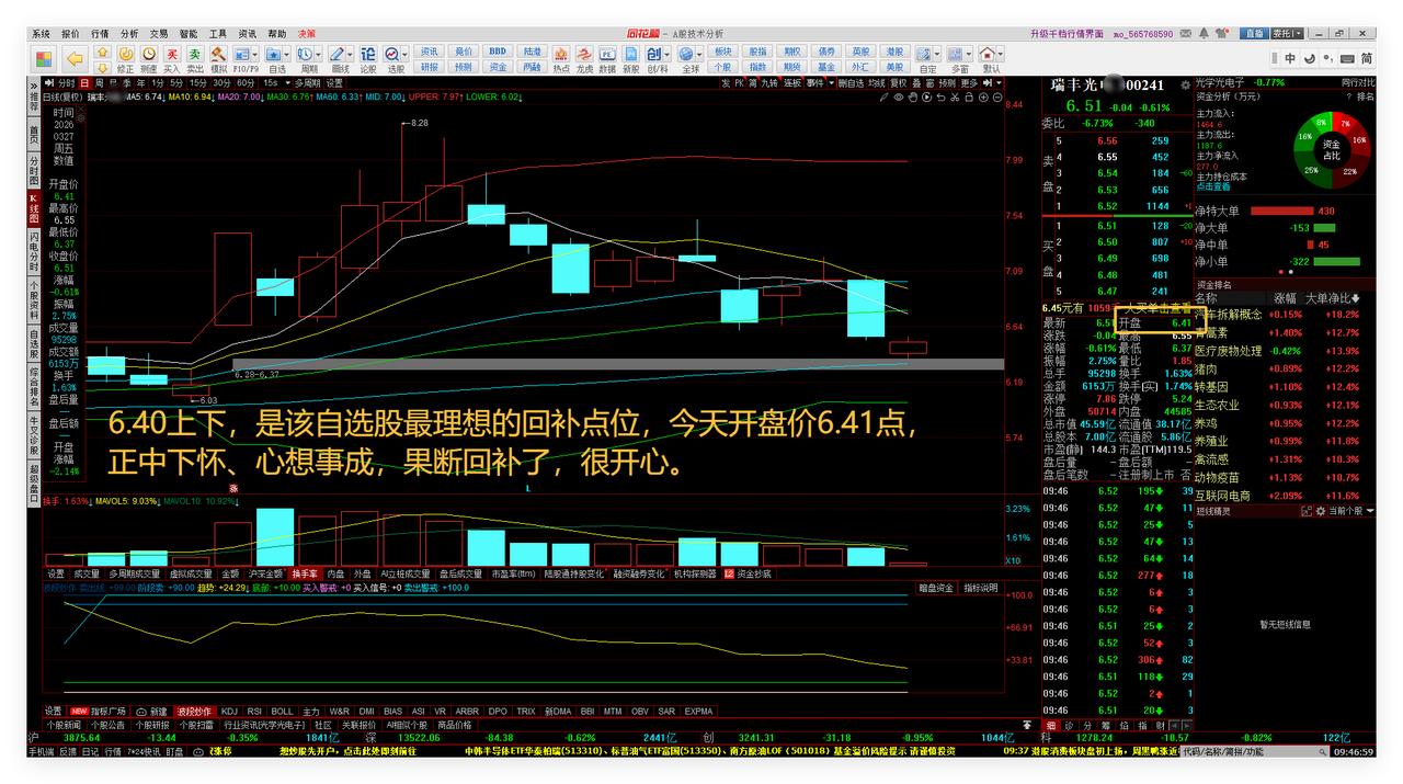 大盘低开的理想典范!心想事成:给了我低位回补的好机会! 1、大盘低开的理想典范! 这是我昨晚的技术分析画图,3855点那条线就是近期在大盘技术回踩时中规中矩的最理想的点位。果然,今天开盘,大盘就直接开在3852点,非常接近大盘实战趋势预判的3855点了。可见,做好大盘实战趋势预判,也是有价值的。敬请参阅附图1。 2、心想事成:给了我低位回补的好机会! 6.40上下,是该自选股最理想的回补点位,今天开盘价6.41点,正中下怀、心想事成,果断回补了,很开心。敬请参阅附图2。 可以T+0的ETF中长线自选股,今天也是给力,给出了合适的低位回补机会。敬请参阅附图3。 这个连续下跌的自选股,跟踪和微小仓位尝试中。敬请参阅附图4。 本文是我的股道修行日记。 老铁们下期再见点赞发财。