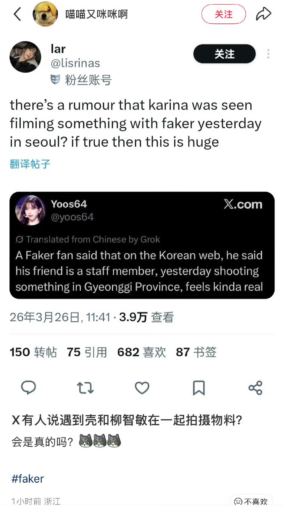 真的假的?!x上网友说,faker和柳智敏在拍物料所以拍的是什么呢