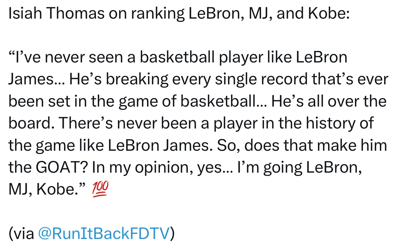 “我从未见过像勒布朗·詹姆斯这样的篮球运动员……他正在打破篮球比赛中设定的每一项纪录……他无处不在。在篮球历史上,从未有过像勒布朗·詹姆斯这样的球员。那么,这使他成为历史最佳吗?在我看来,是的……我的排名是勒布朗、MJ、科比。”