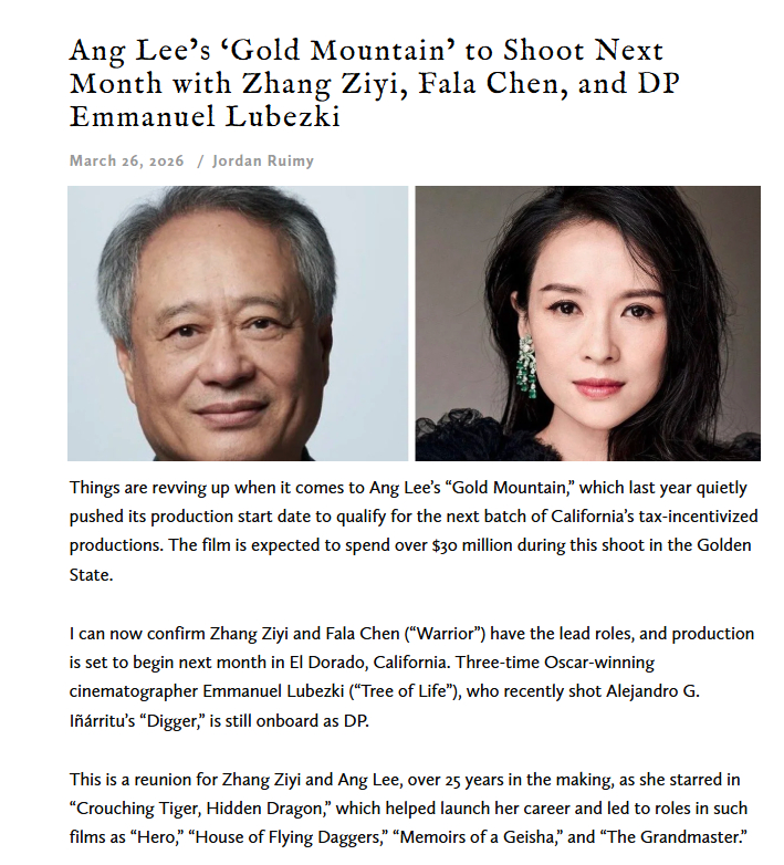 【外媒:章子怡陈法拉主演李安新片】李安章子怡合作新片金山 哇,章子怡说下月要进的组是李安新片吗?据World of Reel,由李安执导,章子怡和陈法拉主演的新片《金山》(Gold Mountain)计划下月在加州埃尔多拉多正式开机。曾三度获奥斯卡奖的摄影师艾曼努尔·卢贝兹基(代表作《生命之树》)担任摄影指导。对章子怡和李安而言,这是一场跨越20余载的重逢。《金山》改编自华裔作家张辰极的《金山的成色》(How Much of These Hills Is Gold),讲述美国淘金热末期,两名沦为孤儿的华裔移民在残酷无情且充满凶险的美国西部挣扎求生的故事。剧本由韩裔美籍编剧郑韩帅操刀,她此前最为人熟知的作品是《弹子球游戏》。《金山》也是李安在2019年《双子杀手》之后推出的首部剧情长片新作,这位电影大师总能在探索“文化错位”“身份认同”等主题时展现其炉火纯青的艺术造诣,而《金山》恰恰与他擅长的领域完美契合。预计该片在加州拍摄期间将花费超3000万美元。