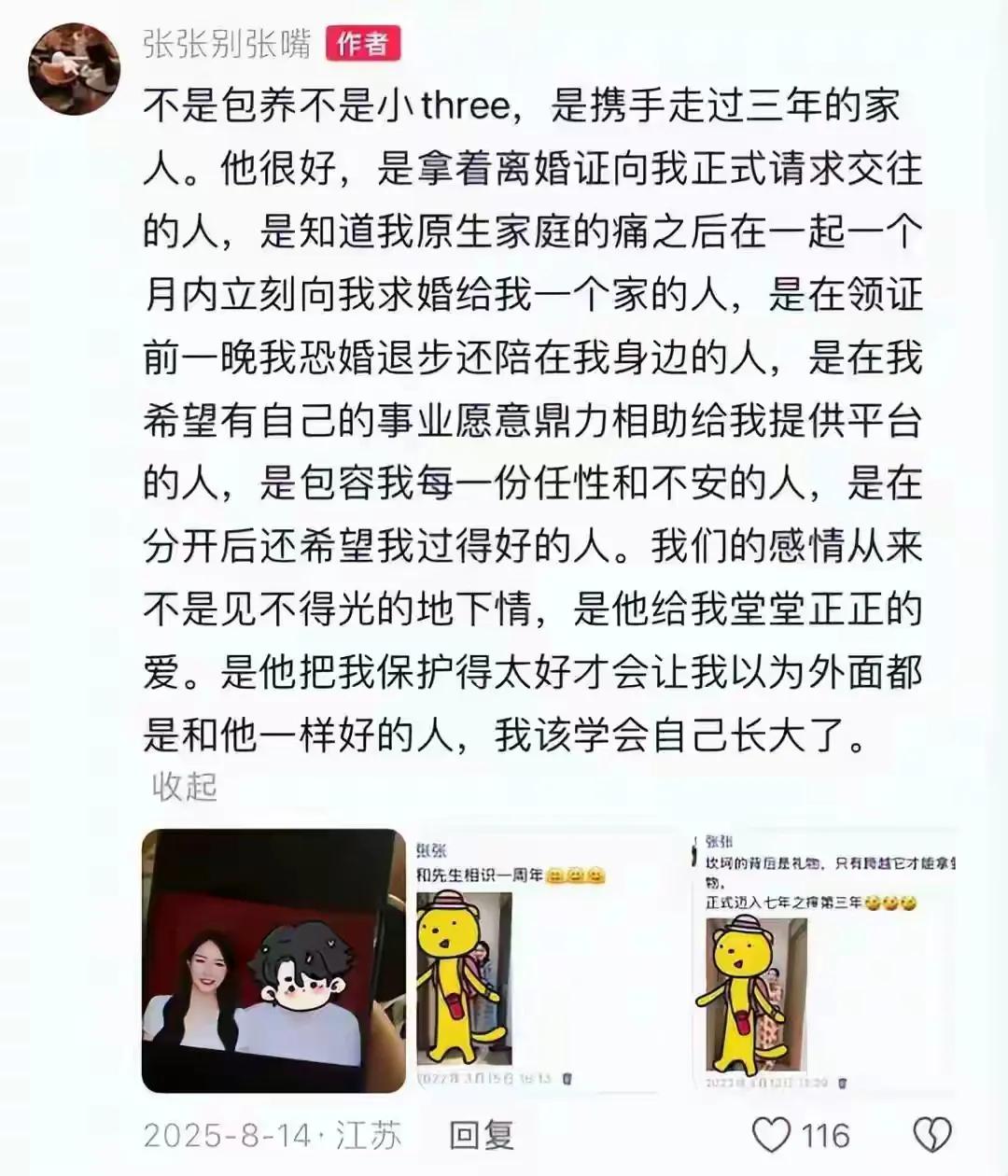 张雪峰前女友,顶着哭肿的双眼皮,不太真实的高鼻梁出来澄清了。这个操作,看来大家都知道张老师离婚了。 原因有三点: 张雪峰爱女儿,典型的女儿奴,在综艺上一家三口现身,女儿张姩菡,快乐得像一个小公主,大家本以为是幸福的一家三口。 如今前女友张某跳出来发讣告,又哭泣,还怒斥网友们不要传谣,可是谁在造谣张老师呢?大家都在缅怀他呀! 1、要不要“张张”跳出来,相信大多数的人不知道张雪峰离婚了。 张张还称自己不公开她与张雪峰的关系,因为她不想给张姩菡带来伤害。 张张称,当年张雪峰离婚半年后,才相识,张雪峰捧着离婚证向他求交往。 2、张张称,自从张雪峰走后,大家都很关心她,这是什么逻辑,已经是前任了。 再说,张雪峰也从未公开过身边的女友,他的世界里只有女儿,只要有空就会骑电动车去接女儿放学。 回到公司,父女俩一同用晚餐,然后孩子在公司做作业,或者玩玩具。 虽然张雪峰很忙,但对女儿的陪伴不少。 3、如今张张这波操作后,大家都知道张雪峰离婚了,甚至还扒出了他的第二任妻子是谁。 张张也许后悔了,两人没有领证结婚,毕竟在一起三年,还是有感情的,她否认为钱而爱。 但斯人已逝,出来说了这么多,貌似有点大不敬,明天是张老师出殡的日子,希望他早登极乐世界。 但是一个热心无私的教育工作者,他给孩子们带来了希望,他的鼓励他的专业,让很多孩子逆天改命,至少未有弯路。