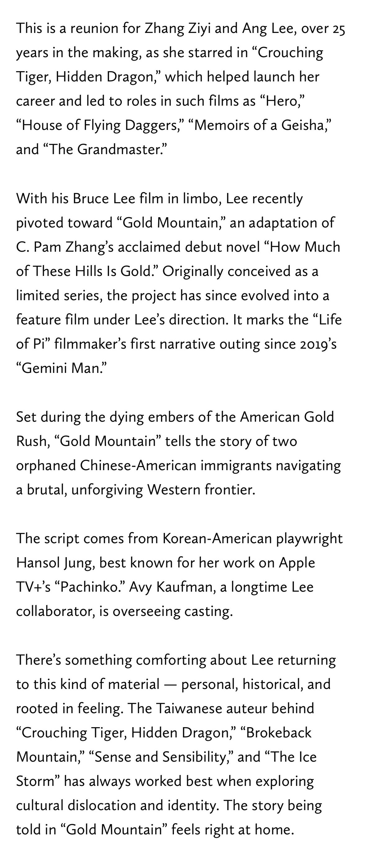 在《马尼拉之战》《李小龙》两个项目接连搁置之后,李安时隔7年终于再执导筒,《老金山》改编自华裔作家张辰极的小说,故事背景设定在美西淘金热的尾声,讲述了两名中国移民孤儿在残酷、荒凉的西部边境艰难求生的故事。