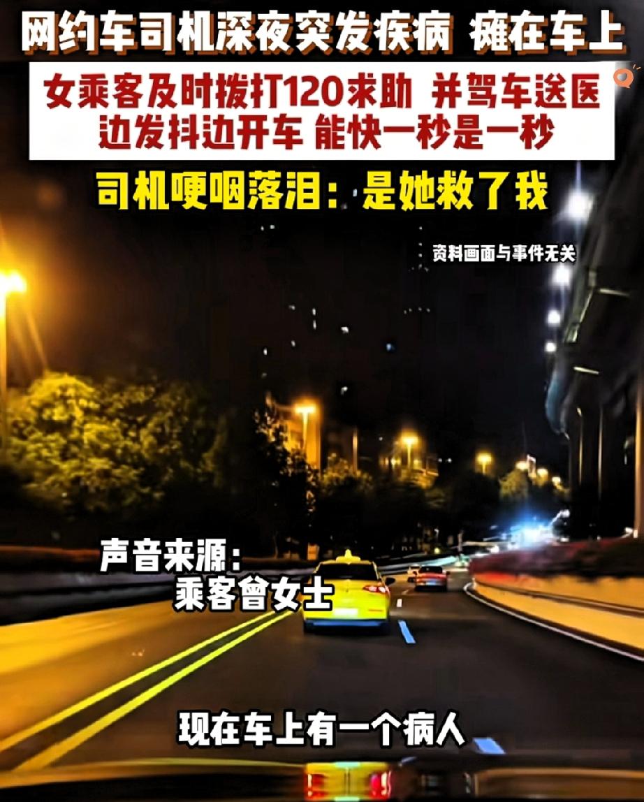 湖南深夜的这场双向奔赴,真的把人暖哭了! 网约车卢师傅半路突发疾病,手麻胸闷到说不出话,却强撑着把车停到安全区求助。 后座的曾女士没有半点犹豫,一边打120一边扶他到后排,自己握紧方向盘往救护车方向赶。 看得出来她肯定也紧张,可全程稳得不像话,还时不时回头安抚卢师傅。 这哪是普通乘客啊,分明是黑暗里递来的救命稻草! 其实善良从不是惊天动地的壮举,而是陌生人危难时的挺身而出。 卢师傅的负责和曾女士的果敢,都是刻在骨子里的温柔。 我们总说人情淡薄,可这样的瞬间却告诉我们,善意从来都在身边,只是需要有人先迈出那一步。 如果是你遇到这种突发情况,会果断伸出援手吗?