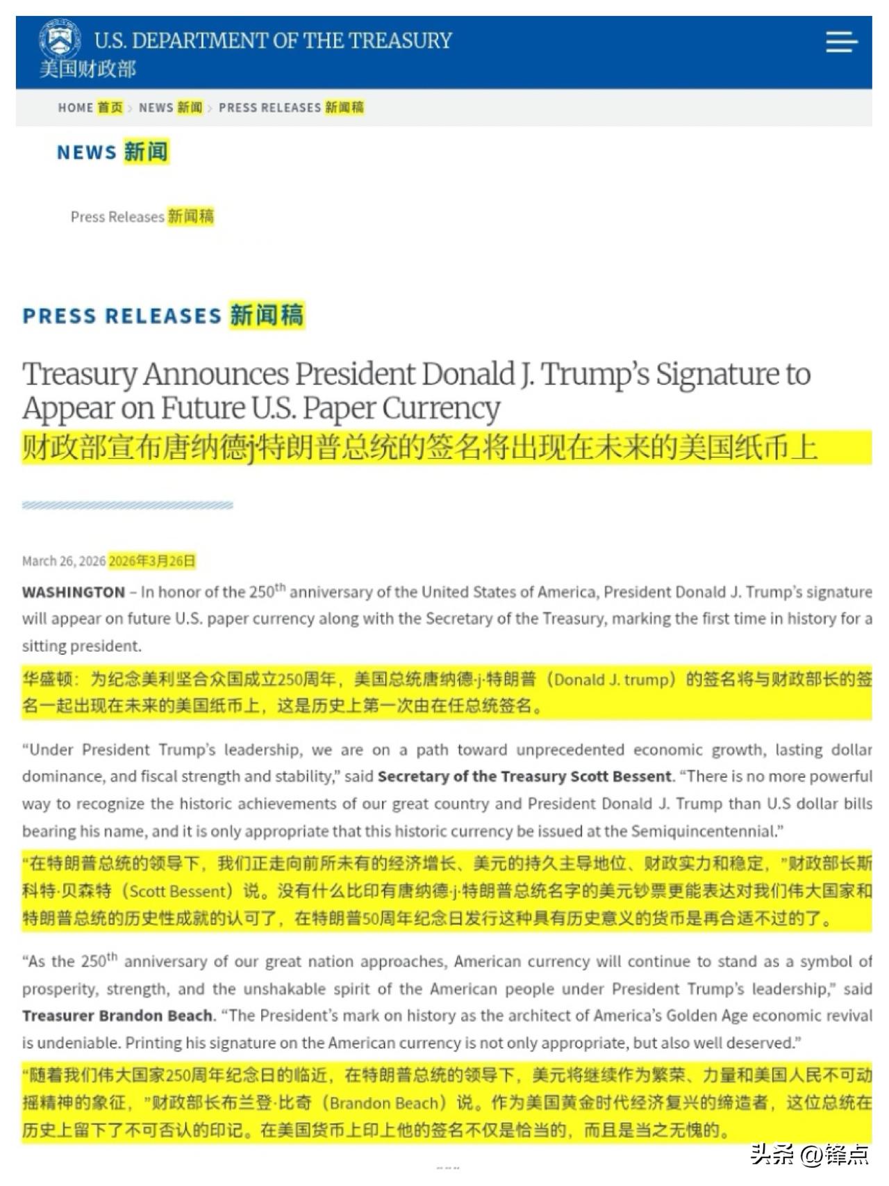 特朗普头像上不了美钞,那就上签名。 美国财政部3月26日宣布,为了纪念美国建国250周年,从2026年夏天起,新印制的美元纸币上将印上特朗普的签名。这是历史上首次有在任总统的签名出现在流通美元纸币上。 特朗普的签名将取代1861年以来一直存在的美国国库长的签名位置,与现任财政部长贝森特的签名并列,出现在美钞上面。这终结了长达165年的“财长+库长”双签名传统。 首批印有特朗普签名的100美元纸币将于2026年6月开始印制,随后数月扩展至其他面额,夏天逐步通过银行体系进入流通。旧版纸币将继续有效流通。 以前,就有议员拍马屁,提议将特朗普的肖像印在新面额250美元的纸币上,以纪念美国250周年。特朗普公开支持了这一想法,他曾转发分享了相关社论和提案,表达了希望自己的形象出现在美元上的意愿。 但是,美国法律(源于1866年左右的规定,体现在《美国法典》中)明确禁止在流通纸币上使用在世人物的肖像。这让特朗普无法直接突破此“红线”,最终只得转向了“签名方案”。 特朗普这个想“名垂青史”的心,真是坚定啊!