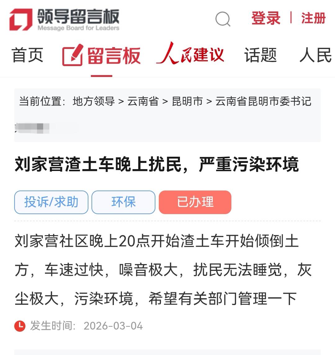 昆明网民反映刘家营渣土车晚上扰民严重污染环境的问题 3月4日昆明网民通过人民网领导留言板给昆明市委书记的留言 刘家营渣土车晚上扰民,严重污染环境 刘家营社区晚上20点开始渣土车开始倾倒土方,车速过快,噪音极大,扰民无法睡觉,灰尘极大,污染环境,希望有关部门管理一下 发生时间: 2026-03-04 📢📢📥2026-03-25 19:00 昆明市公安局交警支队,昆明市生态环境局呈贡分局官方回复 网民同志:您好! 您通过人民网领导留言板的留言收悉,经昆明市生态环境局呈贡分局、昆明市公安局交警支队调查处理,现将有关情况回复如下: 接到投诉后,昆明市生态环境局呈贡分局环境执法人员立即对投诉反映的刘家营社区现场进行检查,经核实您反映的实为中铁五局集团有限公司滇中引水工程昆明施工6标项目9号支洞渣场恢复回填项目,该项目施工手续合法齐全。施工期间因场内土方倒运、运输车辆途经社区道路,产生扬尘污染,噪声扰民。 现场检查时,执法人员已对该项目现场负责人提出如下整改要求: 一是规范运输作业,要求车辆减速慢行、禁止鸣笛、文明行驶; 二是强化文明施工管理,严格落实进出工地车辆车身及车轮冲洗、密闭运输措施,从源头防范物料泼洒造成路面污染; 三是按要求配备专用洒水车辆,结合施工进度与天气状况,对施工区域及途经主要道路及时开展洒水降尘作业,有效控制扬尘污染,保障周边道路环境整洁。目前已督促项目方落实整改要求。下一步我局将加强对该项目巡查力度,持续巩固整治成效发现问题将依法依规进行处理。 关于您反映呈贡区刘家营社区渣土车噪音扰民的事项,交管支队高度重视。交管支队一直以来均将您所述区域道路纳入常态化管理,均部署有相应警力开展交通秩序整治,前期在该区域部分路段已增设隔离设施,并多次研究部署开展联合整治行动。 针对您反映的问题,交管支队采取如下工作措施: 一是强化监管源头,近期呈贡区生态环境、综合执法、街道社区等已开展联合整治,相关违规作业行为已得到有效遏制。 二是交管支队将依法履行交通安全管理职责,持续强化巡查管控力度,积极协同相关职能部门巩固治理成效。 三是严查渣土车交通违法行为,在您所述渣土车高频通行路段,重点时段增设执勤点位,采取“固定检查+流动巡逻”相结合的方式,重点查处违反交通信号灯、不按规定路线行驶等违法行为。 四是进一步加强安全宣传教育,要求驾驶人在通行过程中文明守法,特别是行经居民小区附近时必须降低车速,禁止鸣笛,以最大限度减少因车辆通行产生的噪声污染。您若遇上述相关路段有交通违法等情况时,可拨打交管支队或者辖区五大队电话,交管支队将第一时间指派警力前往处置。 下步工作中,交管支队将依法履行法定职责,持续加大管理力度,为广大人民群众创造一个有序、安全、通畅的道路交通环境,不断提升人民群众对交通管理工作的满意度。 感谢您的理解与支持,顺祝身体健康、生活愉快! 渣土车 夜间扰民