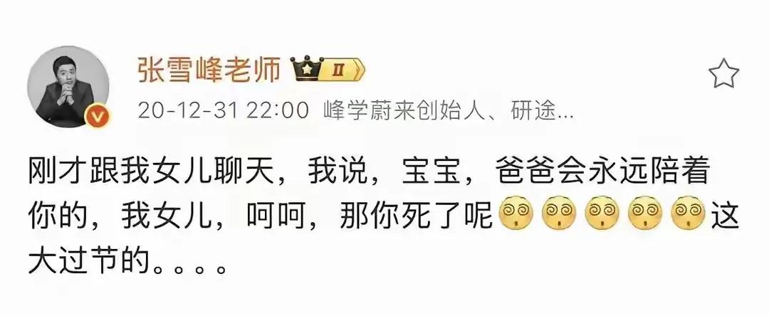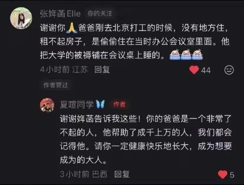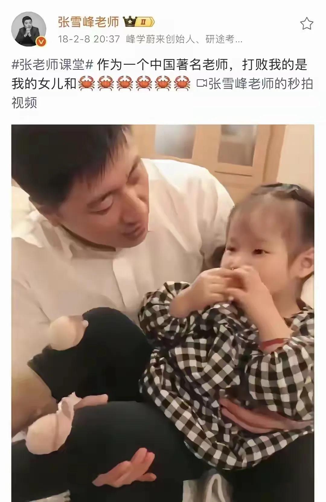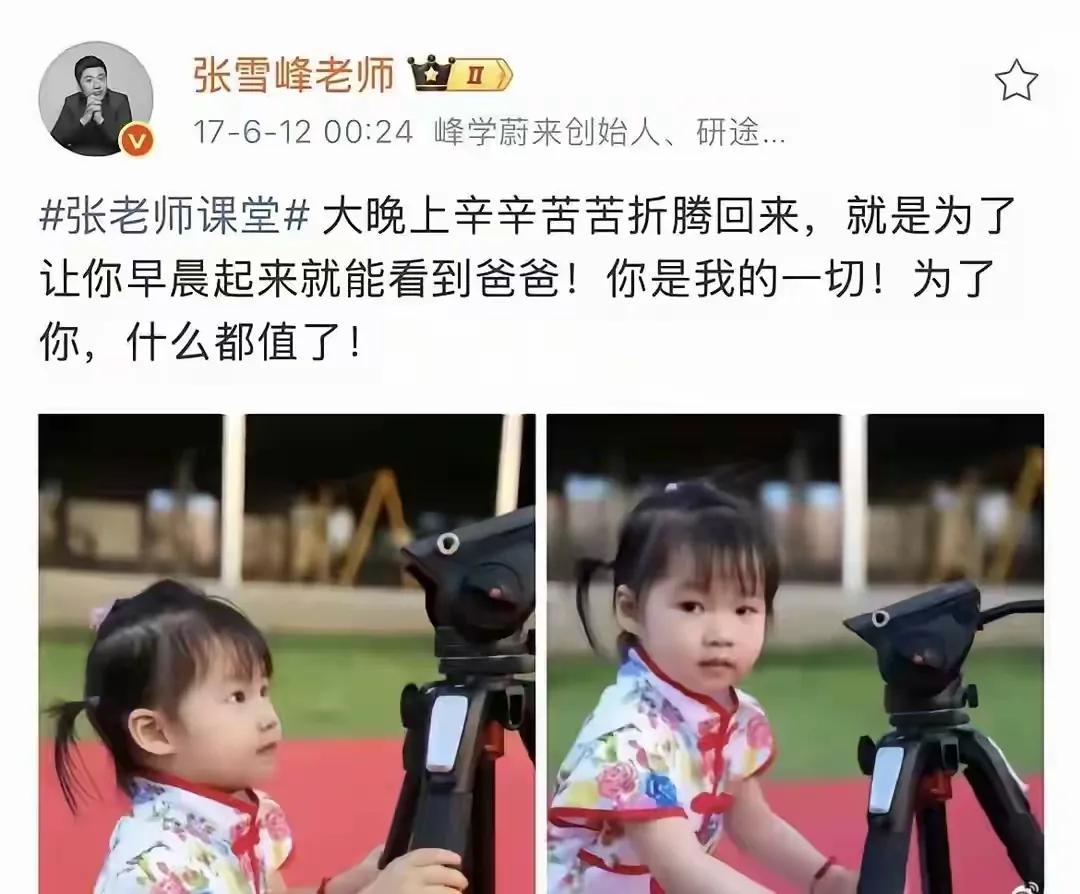不愧为张雪峰的女儿,11岁的她竟然有如此出众的见解! 张雪峰离世的这几天,除了冷冰冰的讣告之外,家人无一发声,不过,也能理解,发生这样痛彻骨髓的噩耗,任由钢铁战士,也要消化好一阵子了,更何况有血有肉的肉身凡胎呢? 直到昨天,张雪峰的前女友发视频请求那些恶语连声,让逝者不得安宁之人,都口下积德,让他安安静静地走吧,这时候,很多人才意识到,一直以指点江山的大师形象立世的张雪峰,也是一个有着感情,血肉丰盈的普通人。 他也会因为爱而泪流满面。 尽管他的爱,也给过妻子,前女友,乃至于成千上万需要他指点迷津的考生与家长,但能让他万千宠爱集于一身的,还是唯一的女儿张姩菡! 3月27日,张雪峰在人间的这个最大的牵挂,也用她稚嫩却不失涵养与见解的文字,在最爱她的父亲离世后首度发声! 她是在主持人沈南的视频评论区,留下一番话的。 她表示,自己对于父亲被选上去天上当文曲星的说法很是认可。 句尾那个触目惊心的哭泣表情,让她彼时的心境一览无余。 也许张姩菡认为,有必要让网友了解一个不一样的张雪峰,于是,在发声感谢了沈南叔叔之余,还讲述了父亲在最穷的时候,是如何自我突破一步步艰难前行的。 当年张雪峰大学毕业的时候,扛着本应该丢掉的被褥,从郑州远赴北京。 当时的张雪峰,穷得一文不名,房租都交不起,只能等同事下班后,睡在会议室的桌子上,条件之苦可想而知。 在有了女儿之后,张雪峰的梦想不再单单是体验成功的喜悦了,更是给女儿赚钱,让她不用辛苦就能过上体面富足的好生活。 以前,不了解张雪峰女儿的时候,还以为她跟所有娇生惯养的小公主一样,恃宠傲物,不可一世。 但是如今,她已经通过这句话,为自己正名,让大家见识到了她的见解独到,与人交流得体礼貌,已经远超一个11岁女孩该有的涵养和格局。 她的这句话,虽然没有笔走龙蛇,水银泻地,但恰恰是这种朴实无华,才更能承载比例合宜的隐忍与深情,并让每一个网友被她的感情打动之余,还能由衷赞美她的通透与格局。 尽管我们知道,某种意义来说,她的话也是在自我麻痹,以及安慰那些跟她一样因为父亲的离开,而痛心疾首之人。 但是从一个天真的孩子口中听到这些,你真的会忘了那些现实的残酷,从而对已经发生的让人心碎的事,产生美好浪漫的想象。 不能不说,张雪峰的女儿,小小年纪,就情商这么高,是很多人穷其一生,都未必修行得来的。 孩子能这样懂事,张老师的在天之灵,应该可以安息了吧?