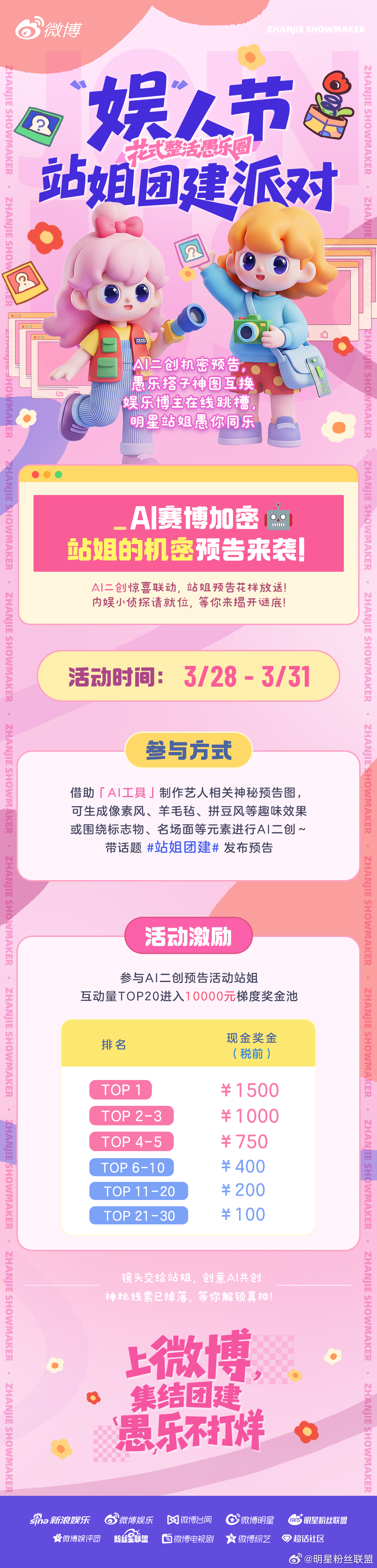 🤖【AI赛博加密】站姐的机密预告来袭AI二创惊喜联动💻站姐预告花样放送!📥「愚」乐小测 你准备好了吗?🌟参与方式:3月28日-3月31日 带话题 站姐团建 发布「AI工具」制作的艺人相关二创预告(内容参考:生成像素风、羊毛毡、拼豆风…或围绕标志物、名场面等元素进行AI二创)