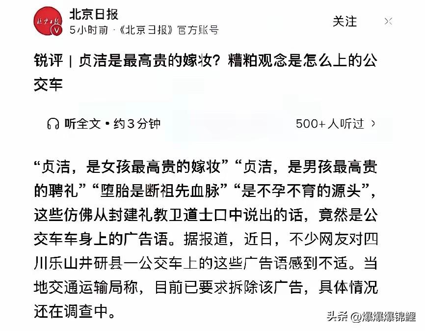 北京日报这次的点评,真是让人看了直摇头。 人家标语明明写着“贞洁是女孩最高贵的嫁妆”,后面紧跟着还有一句“贞洁是男孩最高贵的聘礼”。 这不就是倡导男女都要洁身自好吗?多正常的事。 结果官媒倒好,直接把后半句吃了。光盯着女性那半截猛批,硬扣上“封建糟粕”的帽子,这不是故意断章取义挑起对立吗? 我觉得这事挺荒唐。要求对身体负责、对感情忠诚,到底碰了谁的逆鳞? 公共空间倡导正向道德,又没拿刀逼着谁。就因为几个人觉得刺耳,就要推翻老百姓心里的共识? 说白了,只有那些作风不干净的人,看到这几个字才会觉得被冒犯了。 急着跳脚去骂标语的都是些什么货色,估计大家心里都有数。