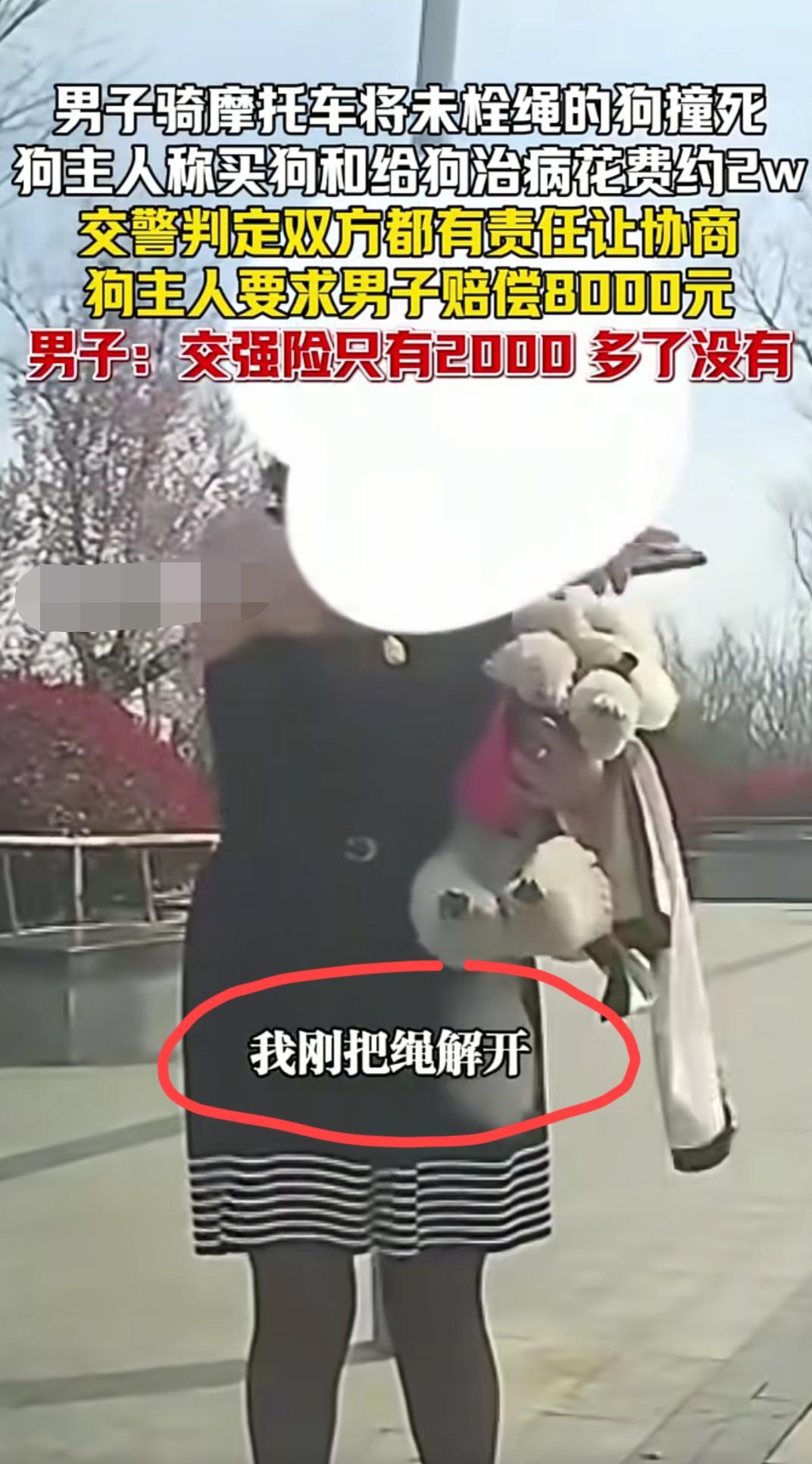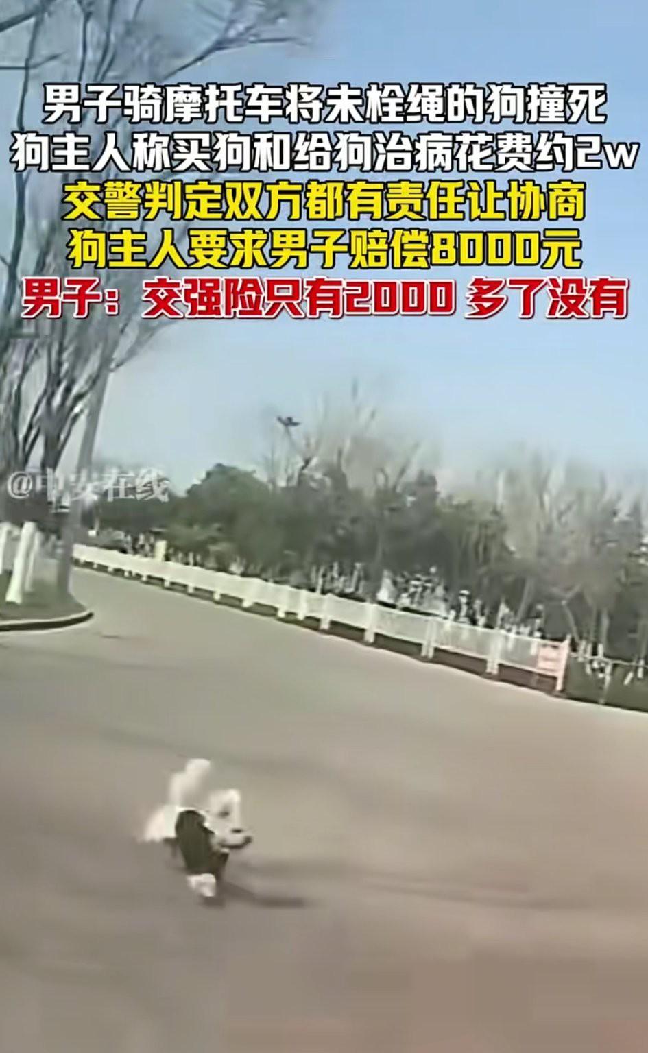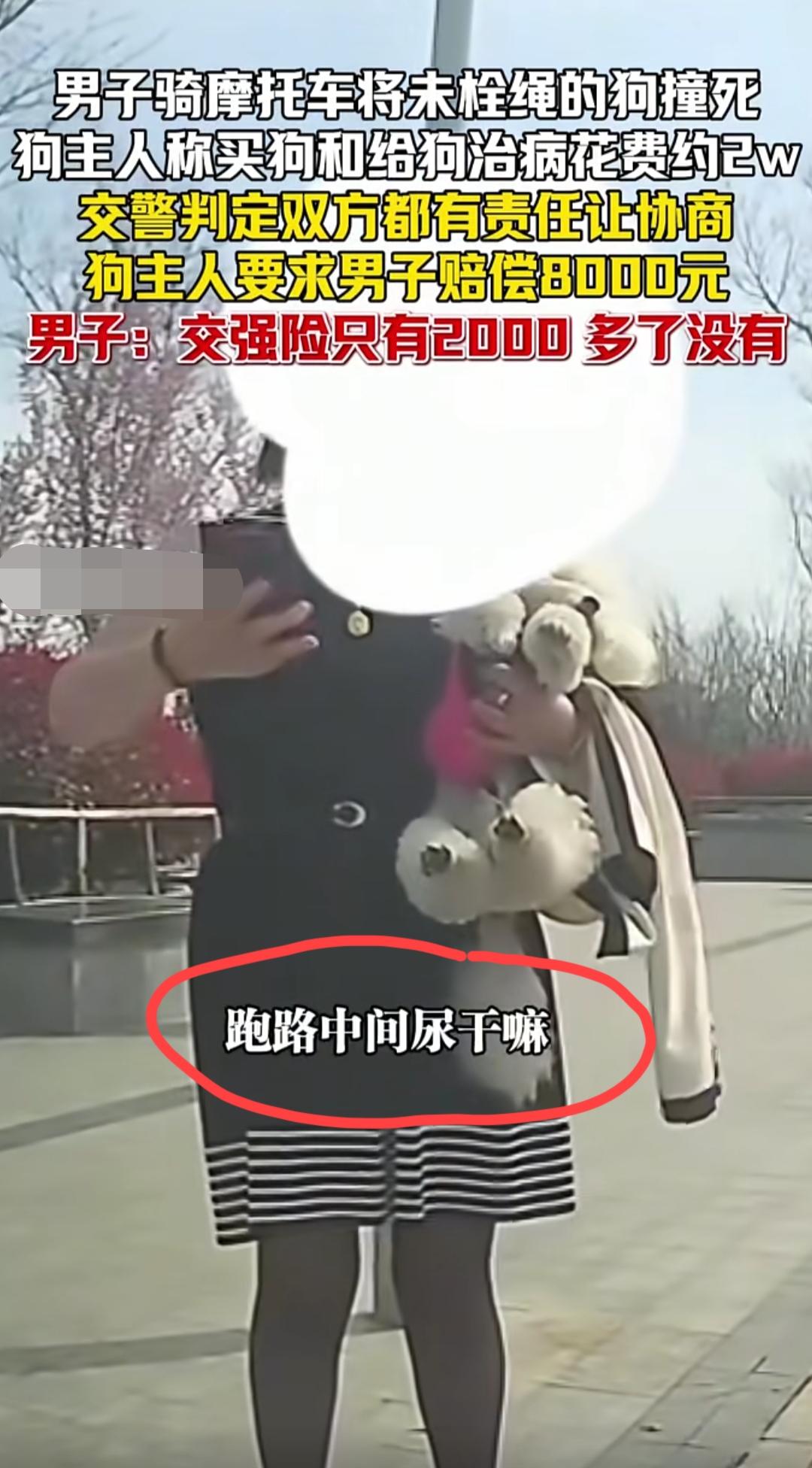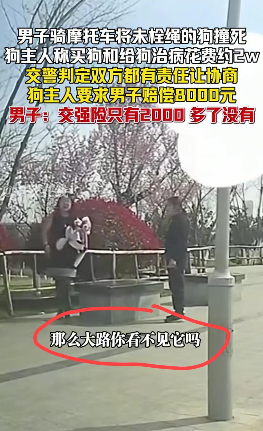 “撞上一条没有拴绳的小狗,要不要赔钱”?这个话题,在网上引起热议! 近日,陕西。男子骑摩托车不慎将未栓绳的小狗撞死,狗主人称买狗和给狗治病花费约2万,交警判定双方都有责任让协商。狗主人要求赔偿8000元,男子则表示交强险只有2000元,多了的没有…… 视频显示,小狗被撞后,女子斥责摩托男子:“这么大路,你看不见吗”,“我刚把它绳子解开,它尿了,你看不到吗”。摩托男子反驳道“它跑路中间尿啊”…… 关于这个事情,网上一边倒的认为摩托男子不必赔她一分钱,让她去起诉好了。 不是说从26年1月1号开始,看到不牵绳的小狗,都可以报警吗?不是要接受处罚吗?怎么到他们这里,变成都有责任了? 各位网友,你们觉得呢?