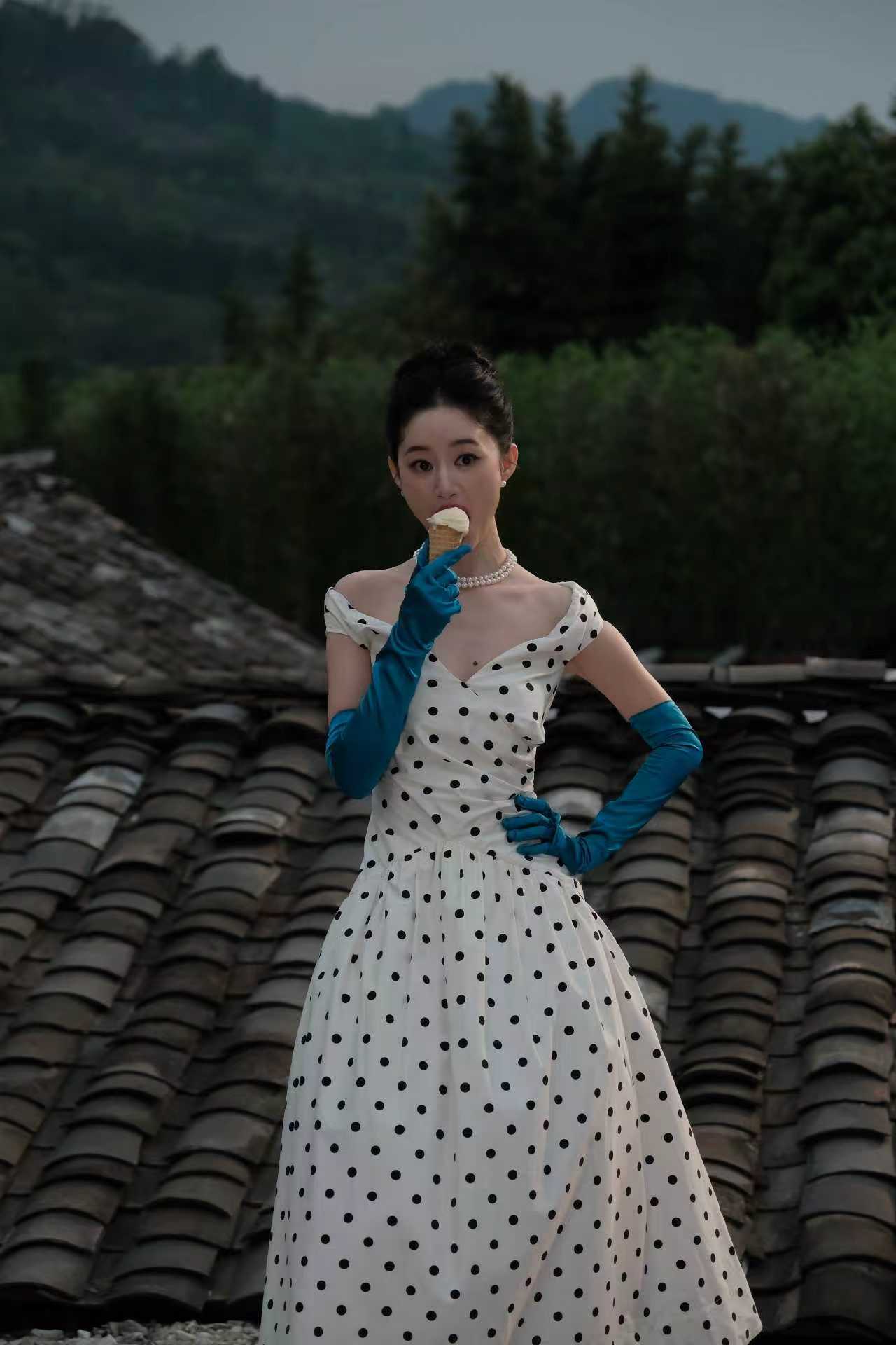 郭晓婷波点女郎 郭晓婷波点女郎V领波点连衣裙+公主盘发,是俏皮可爱的波点女郎呀~在屋顶吃冰激凌的样子也太萌了吧,我要申请坐姐姐车子后座