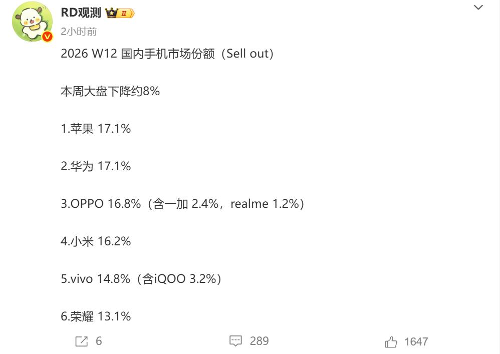 W12华为苹果互换,恭喜雷总,小米大涨,终于冲到第四! 华为连续两周稳居榜首后,W12被苹果以微弱的优势超越,苹果再次来到第一,市场份额为17.1%,华为的市场份额也为17.1%,但略低于苹果。OPPO依然位居第三,市场份额为16.8%。 W12除了苹果和华为互换位置外,小米和vivo也互换了位置,小米连续多周排名第五,W12终于冲到第四,市场份额为16.2%,恭喜雷总。此消彼长,vivo则滑落至第五,市场份额降至14.8%,荣耀依然排名第六,市场份额为13.1%。 2026年W12期间,国内手机市场整体下滑8%,说明在涨价的背景下,消费者的观望在加重,手机的整体销量呈下降的趋势。 2026年3月23日,华为畅享90系列正式发布,宣告华为手机全面回归,畅享90系列诚意满满,目前预售热度很高。华为畅享90系列将于W14正式开售,将带动华为市场份额上涨,后续有望长时间稳居第一。